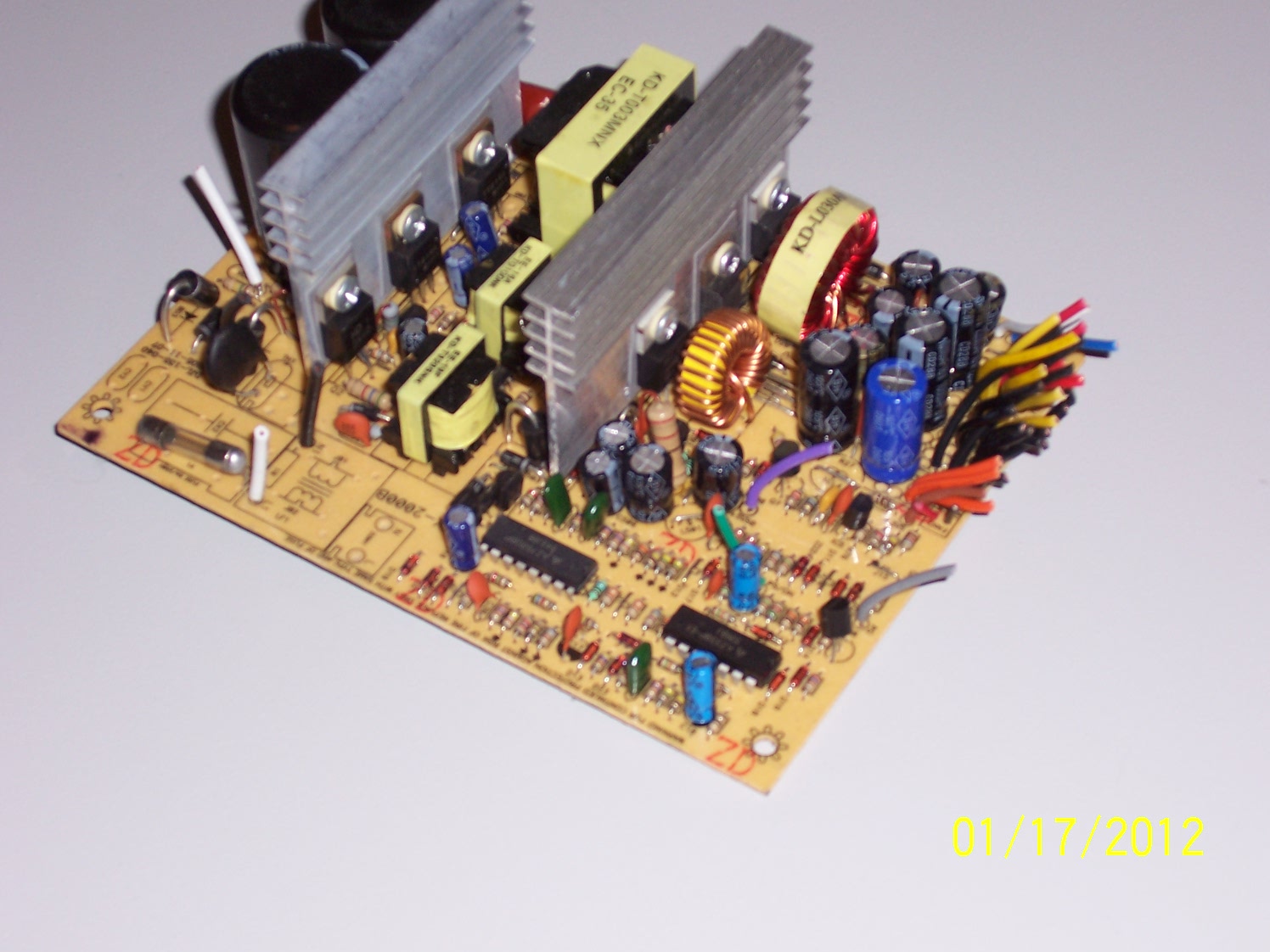 Overhead Shot. 330uf 200v canicon main filter caps. Tiny (all less than 1000uf) micon caps on the secondary. Undersized heat sinks, under sized transformers, super group regulation, missing components, no input filtering, 4 diodes for the bridge rectifier, etc. OEMed by Yuelin.