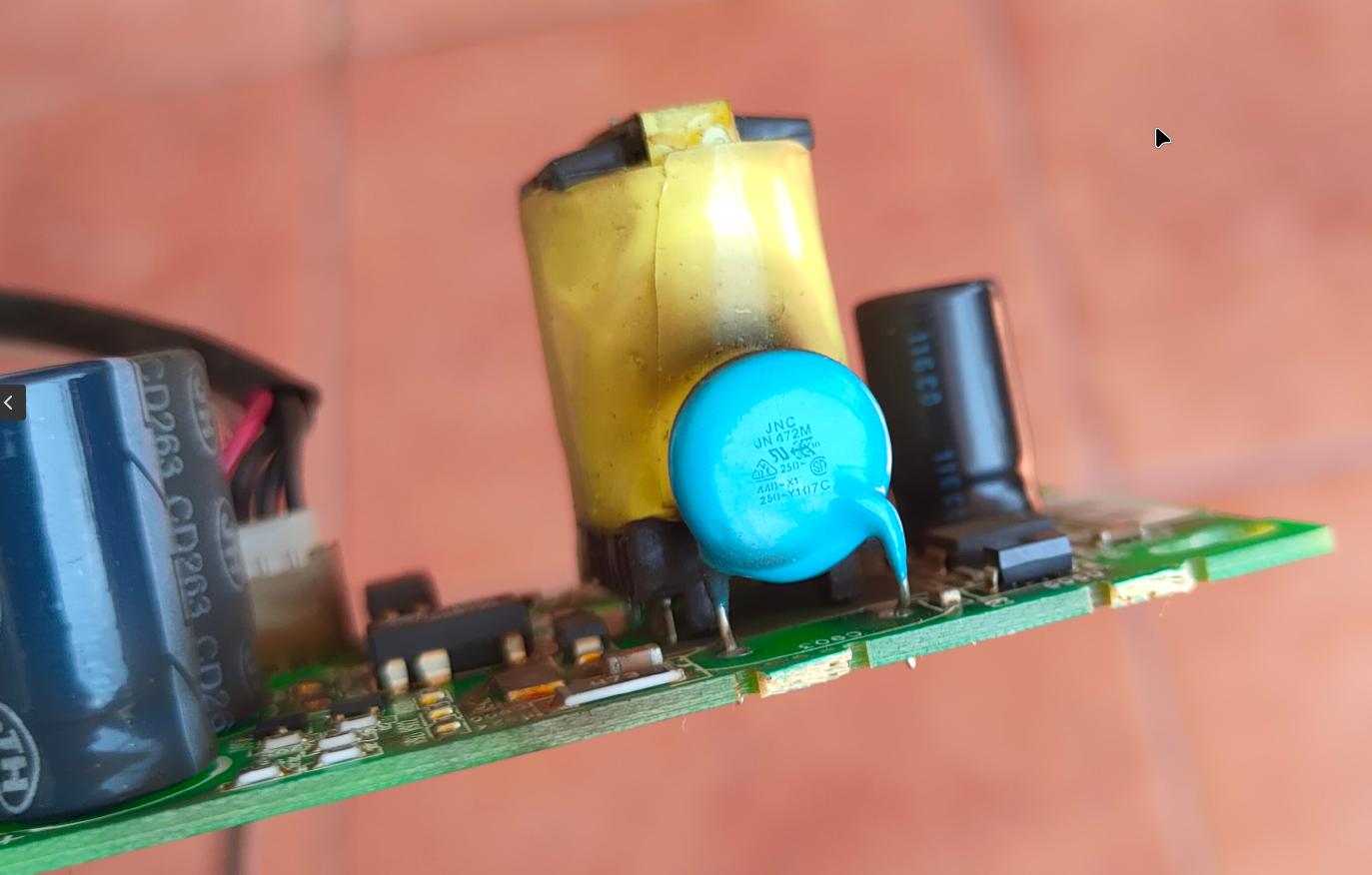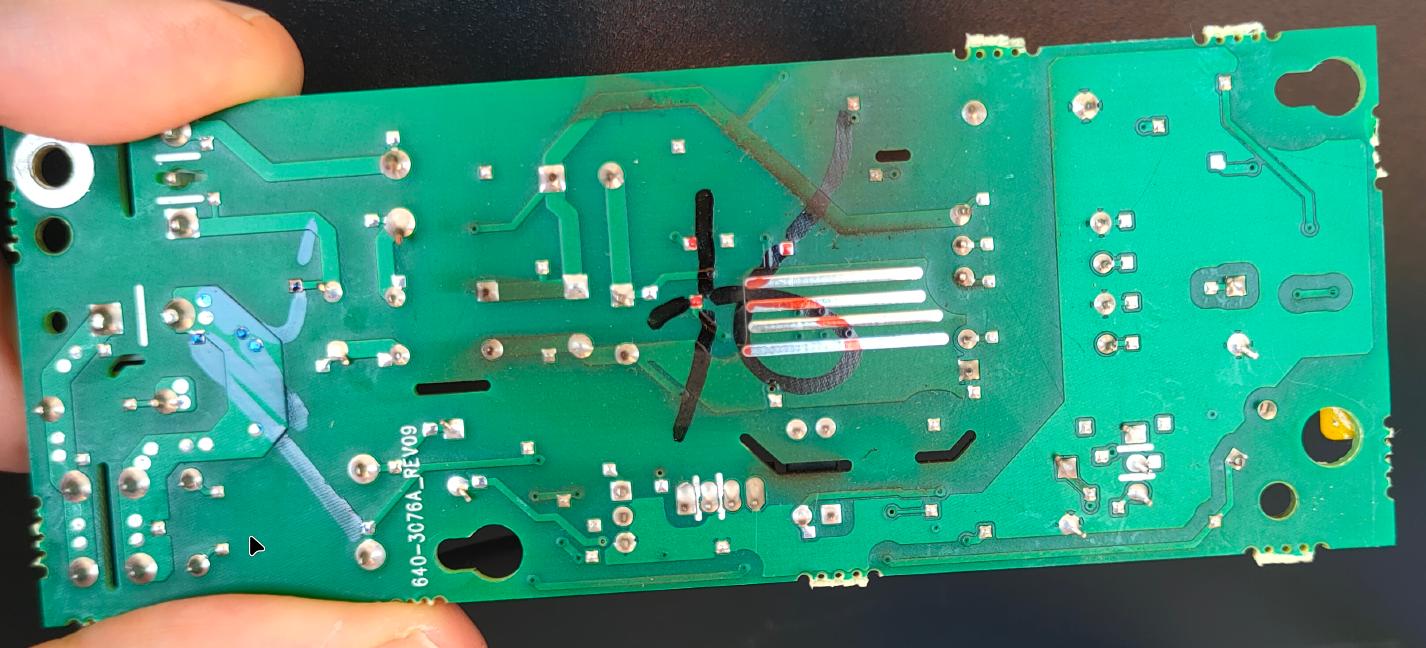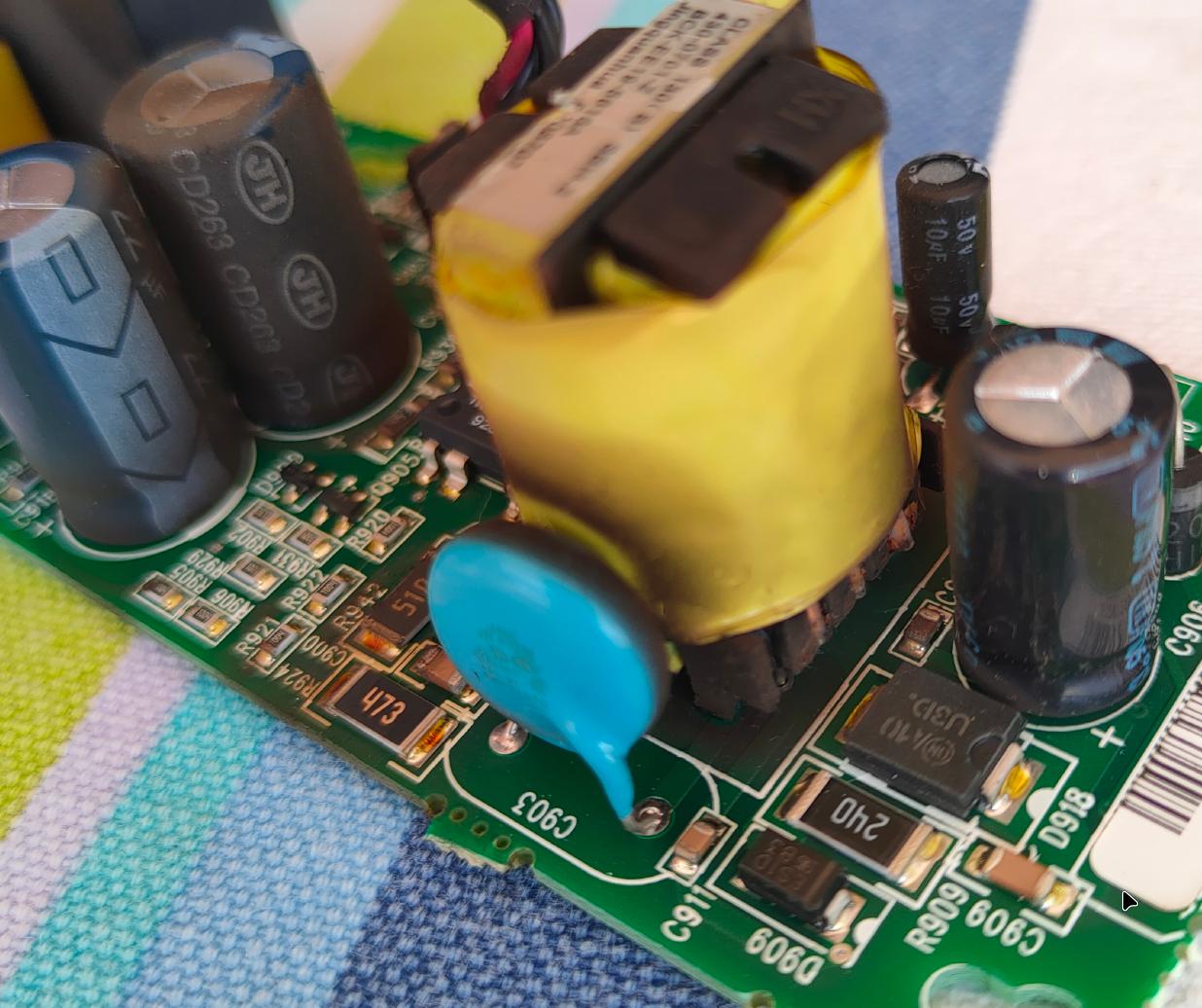 Small PCB is a different story, it was partially covered in some black soot in the region between the blue Y capacitor, transformer and two larger caps.