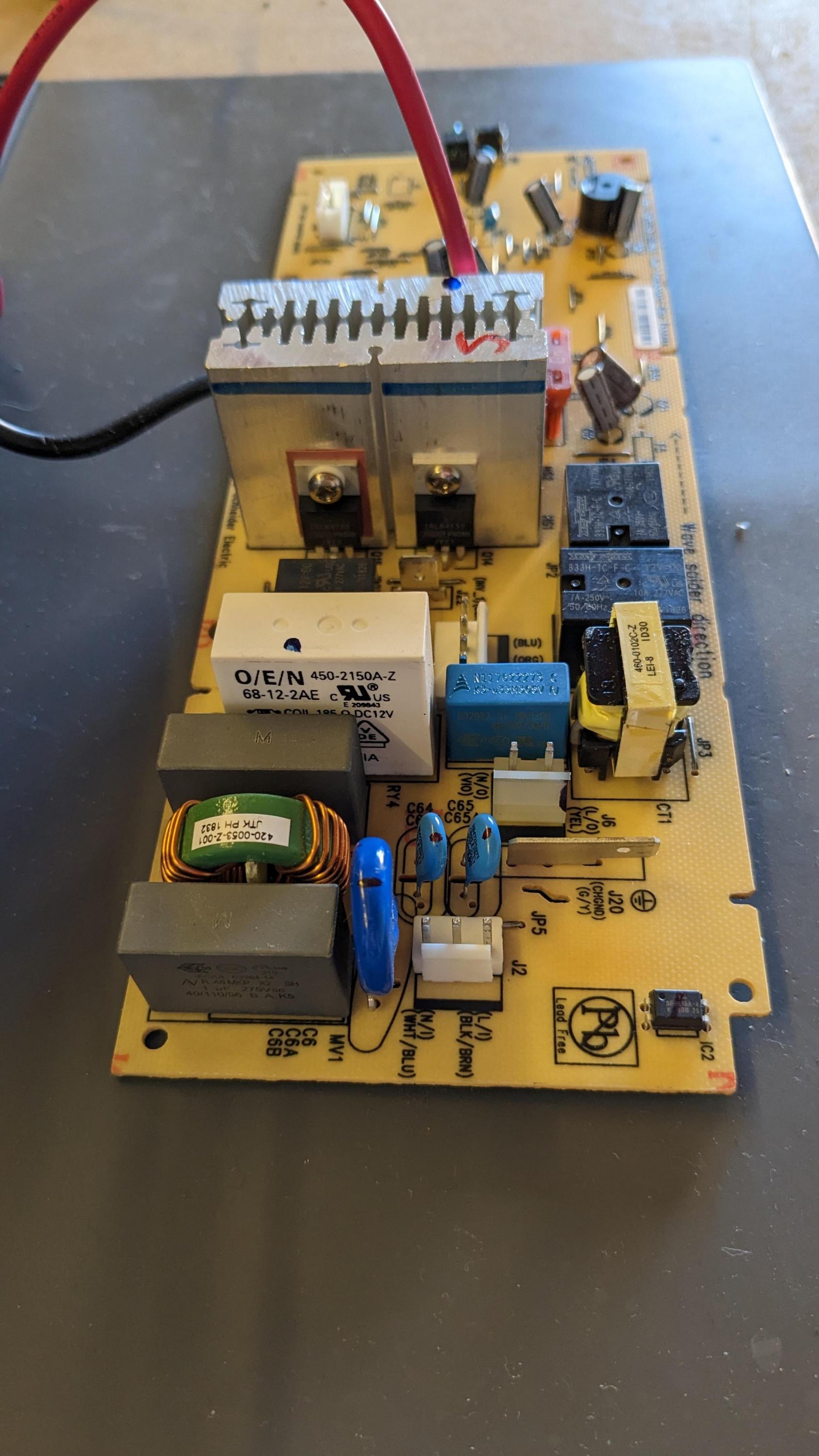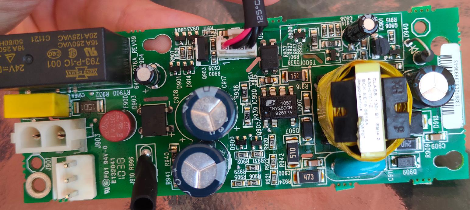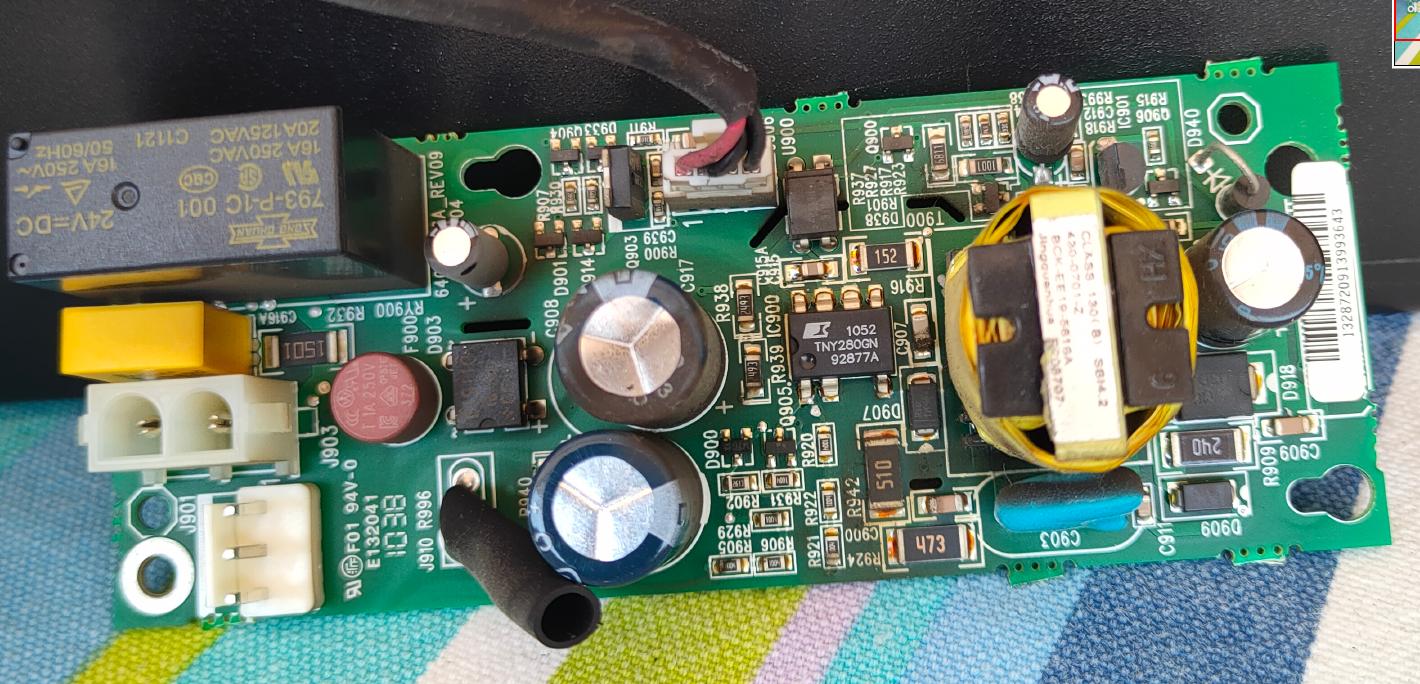 Small PCB is a different story, it was partially covered in some black soot in the region between the blue Y capacitor, transformer and two larger caps.