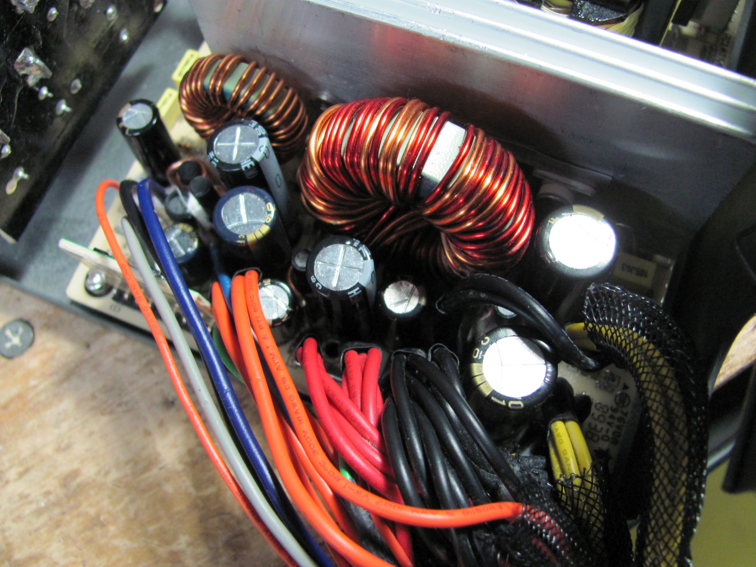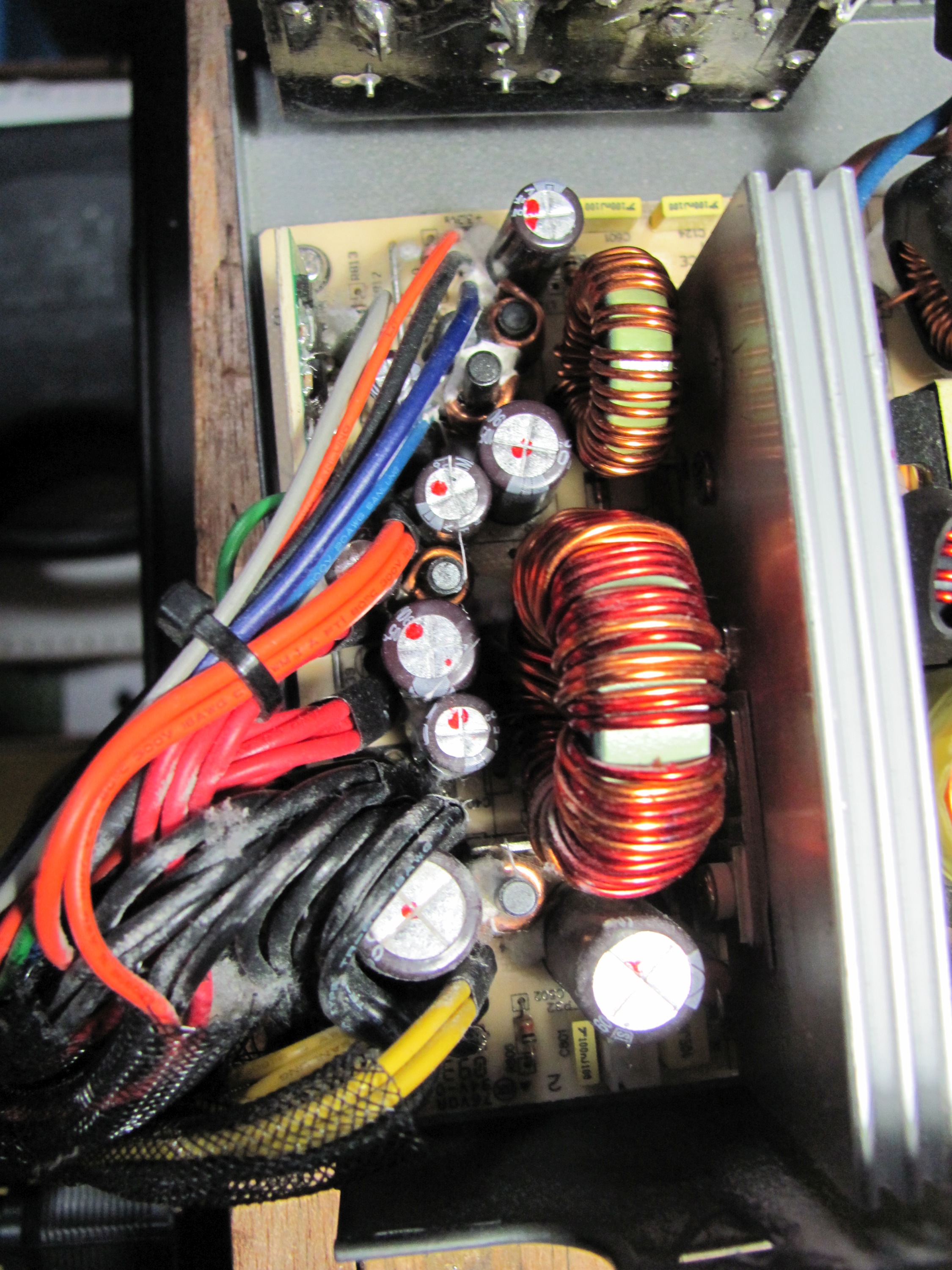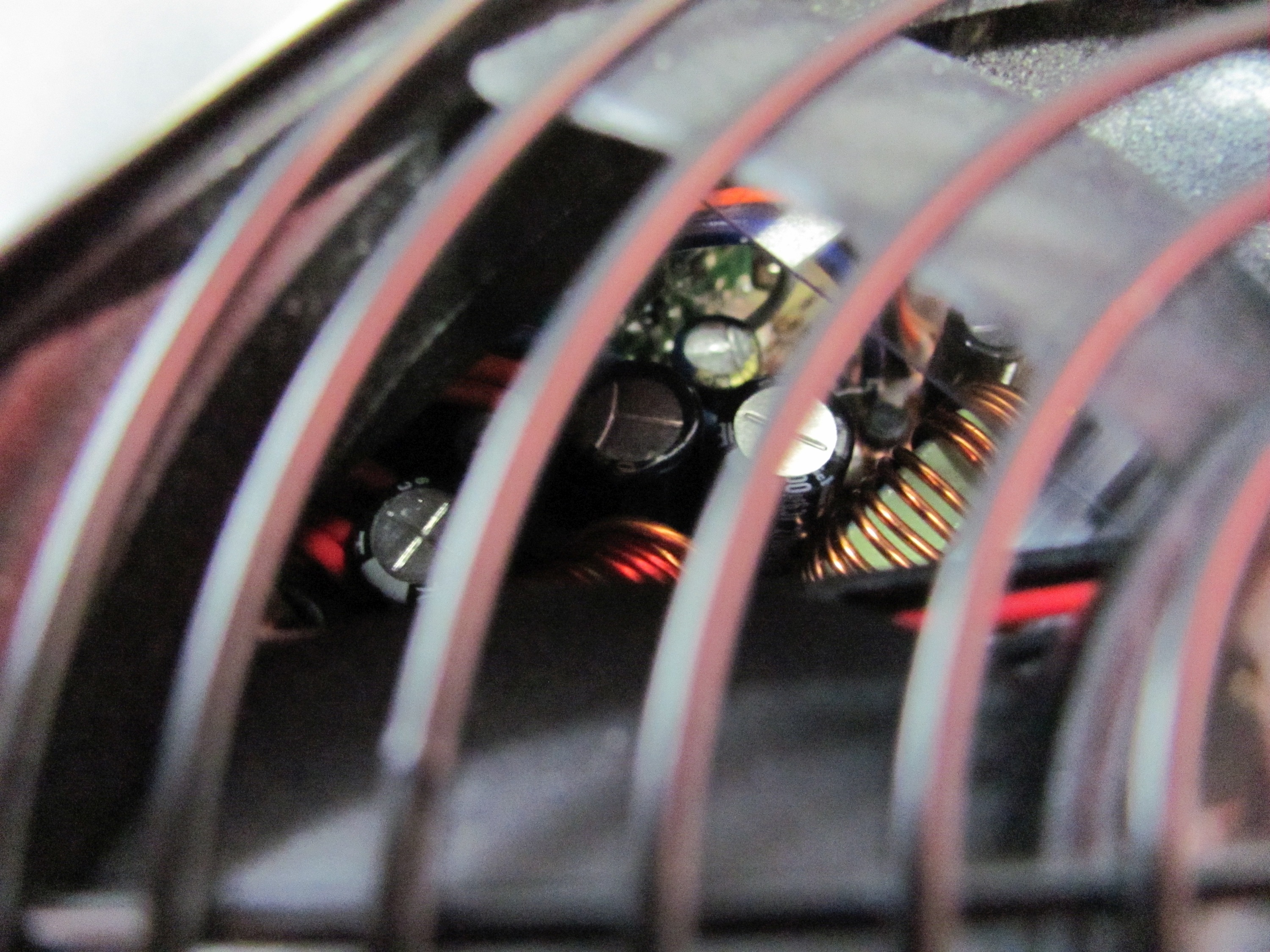 A view of the new secondary caps through the top fan grill of the Antec PSU.