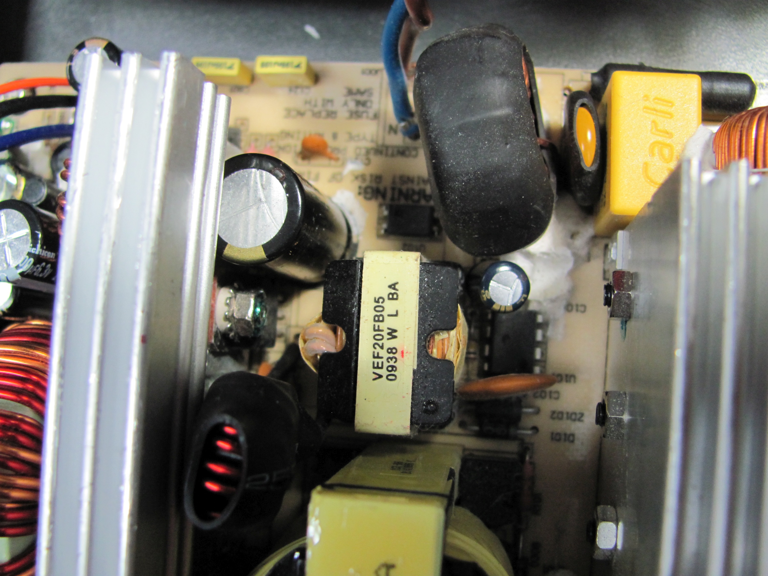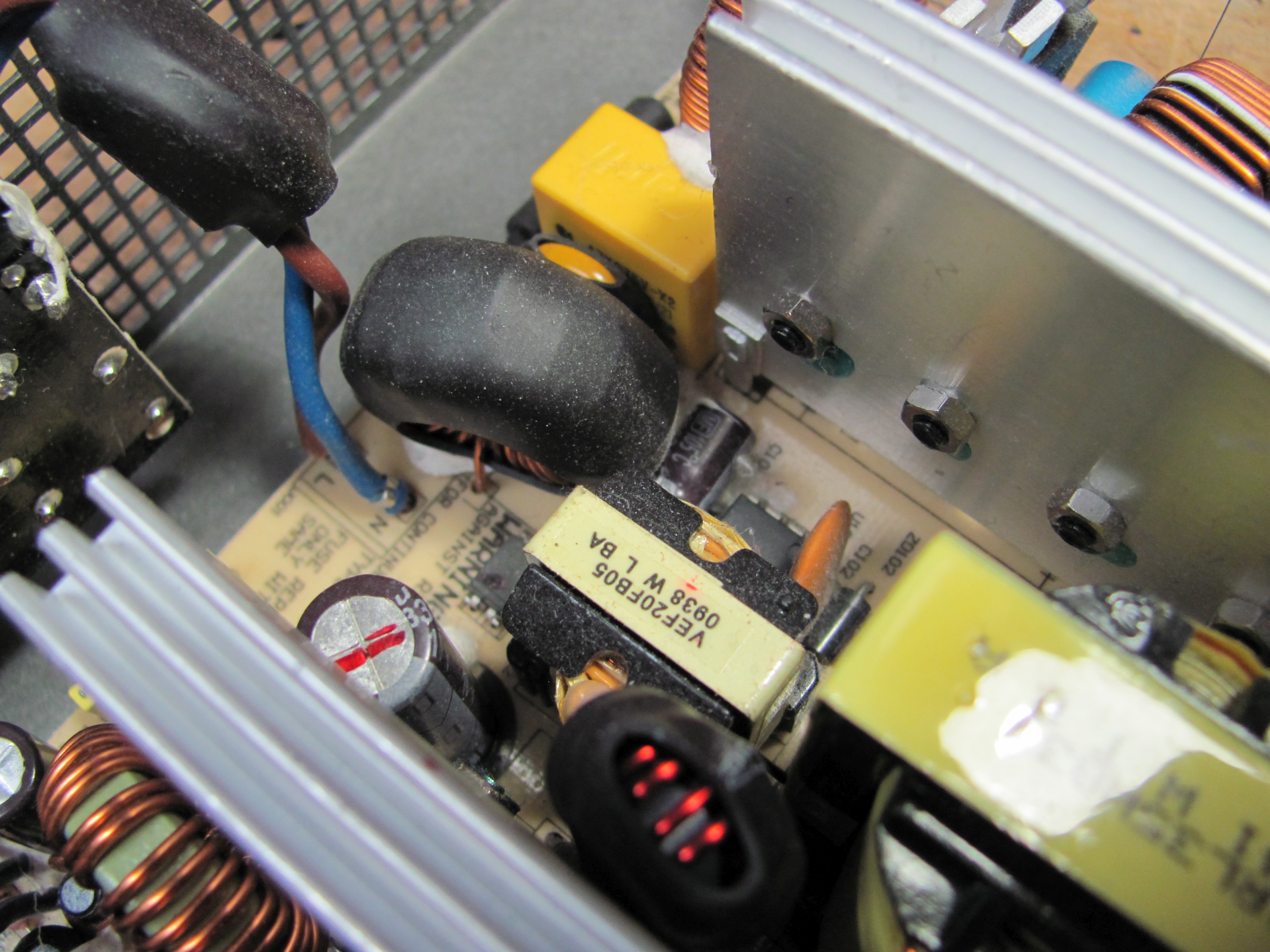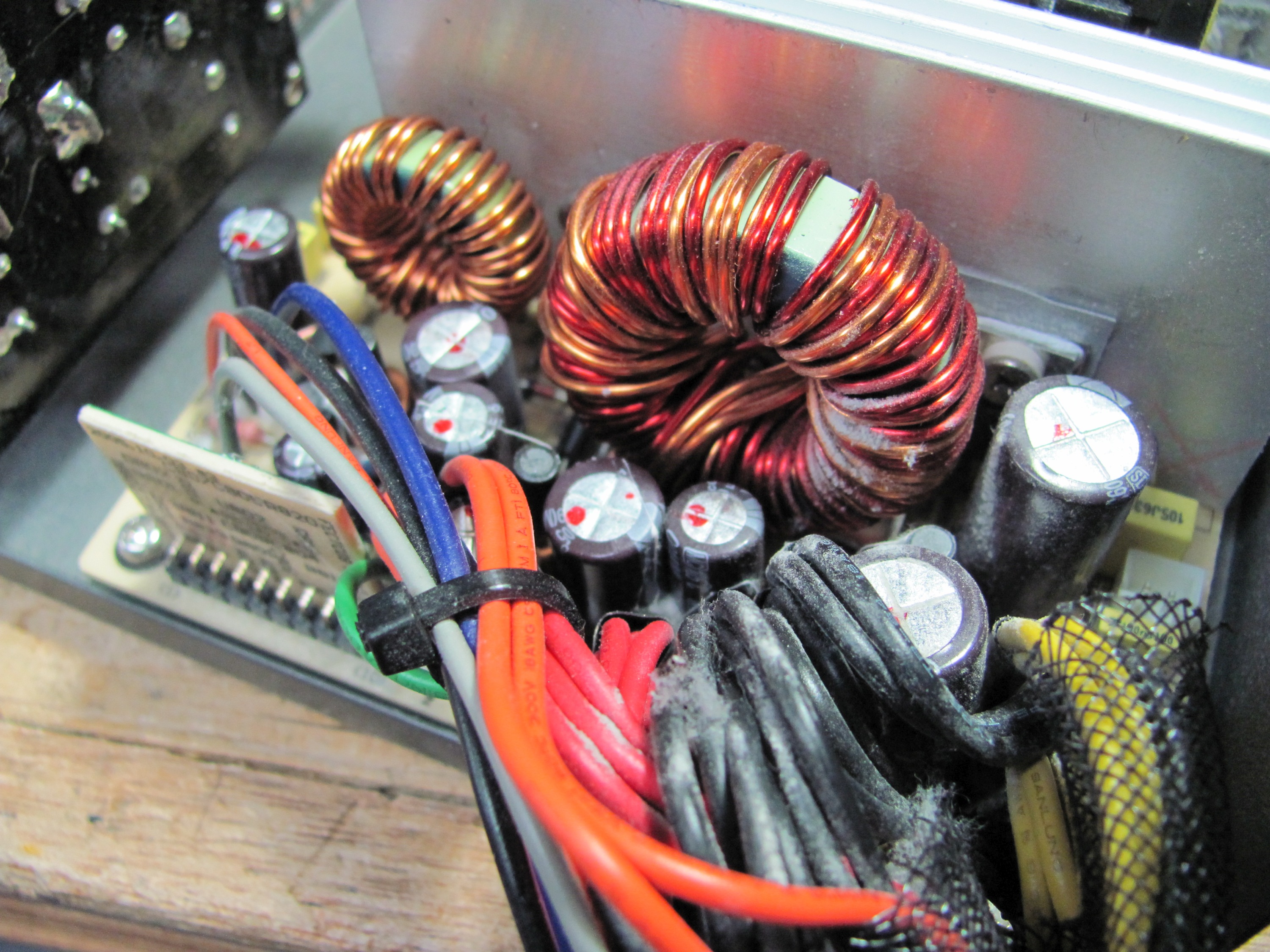 A view of the new secondary caps through the top fan grill of the Antec PSU.