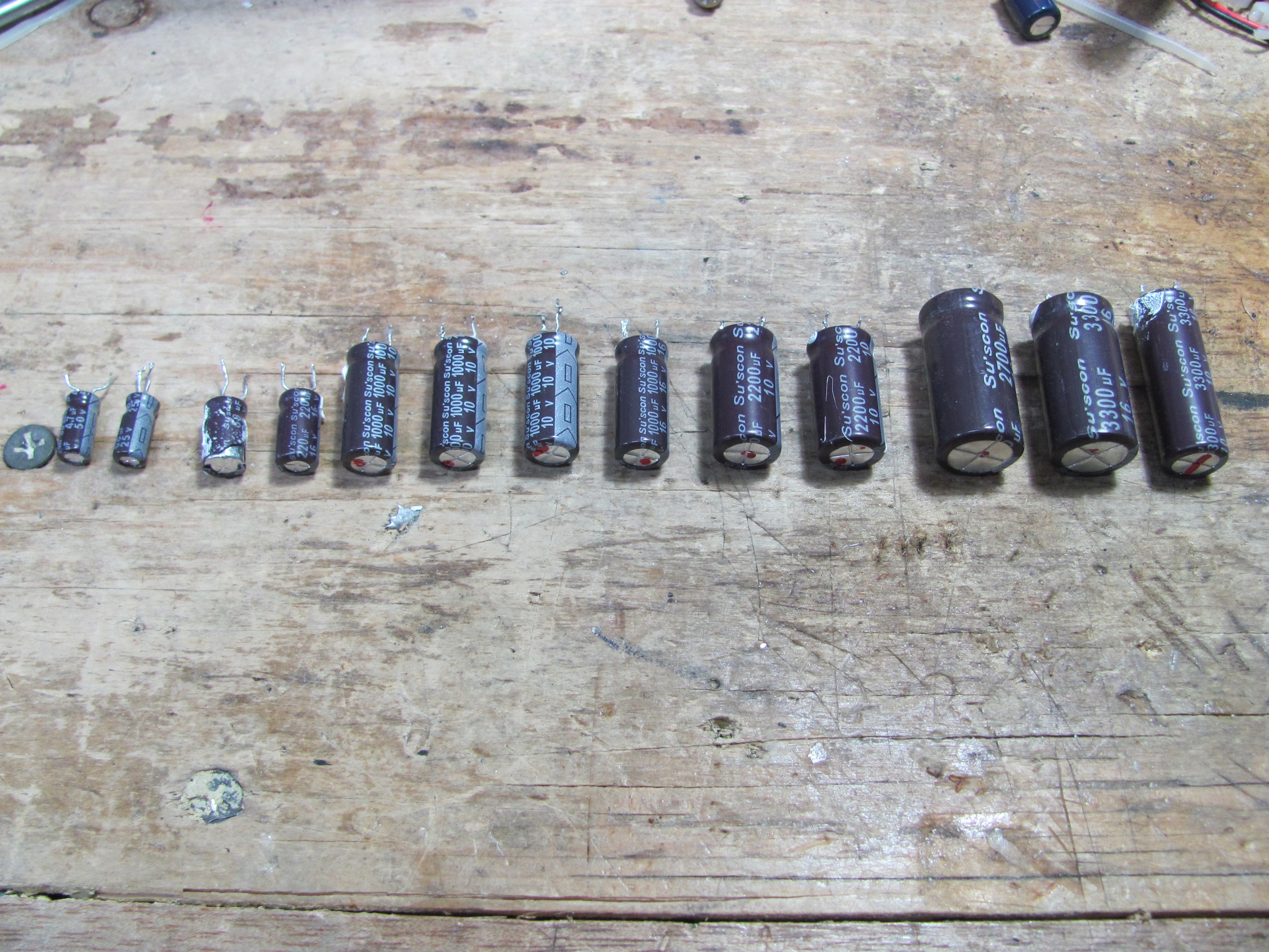 Picture of the old Su'scon capacitors I took out, laid out on the table.