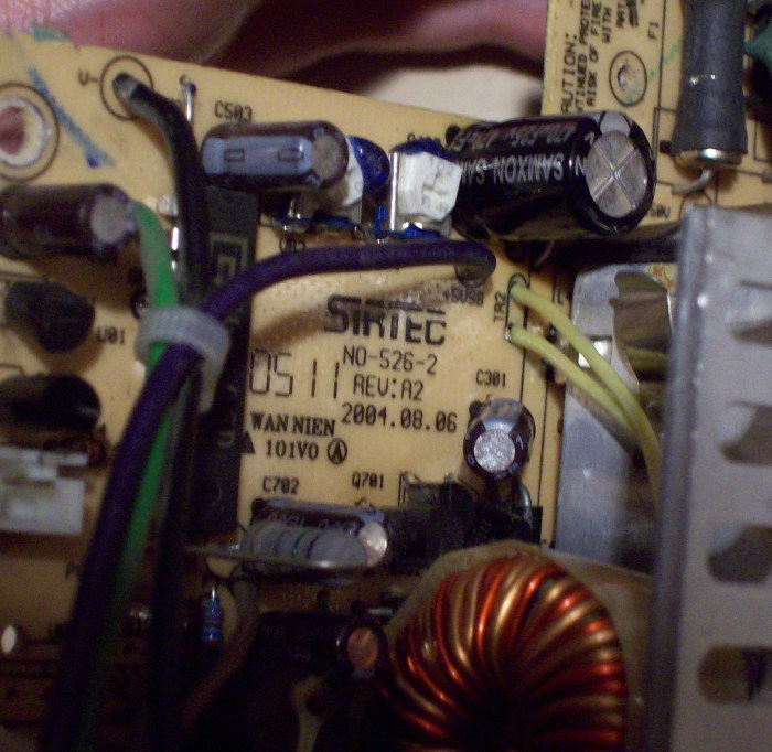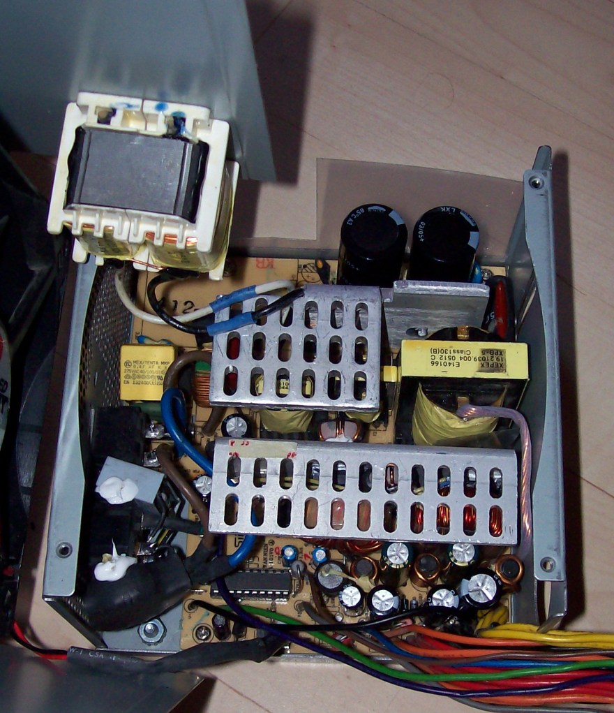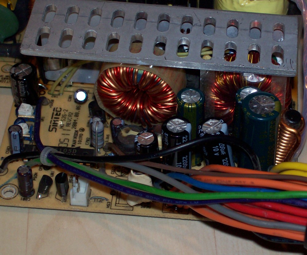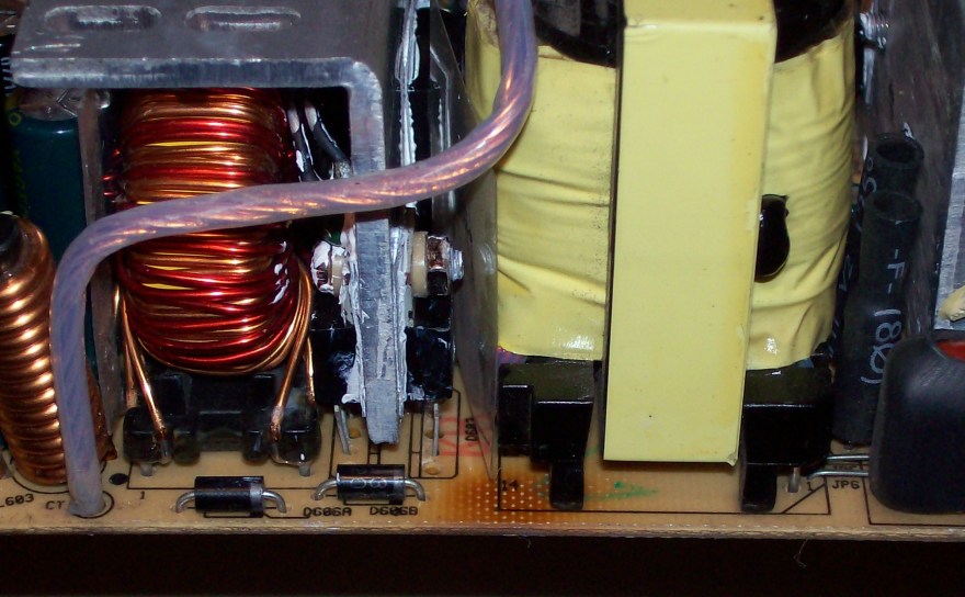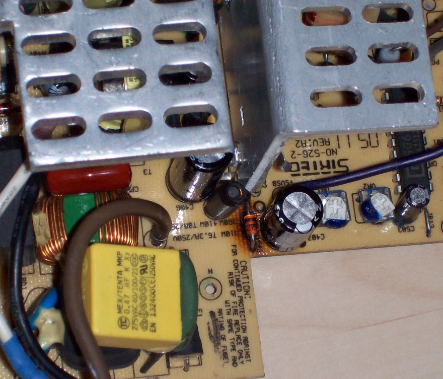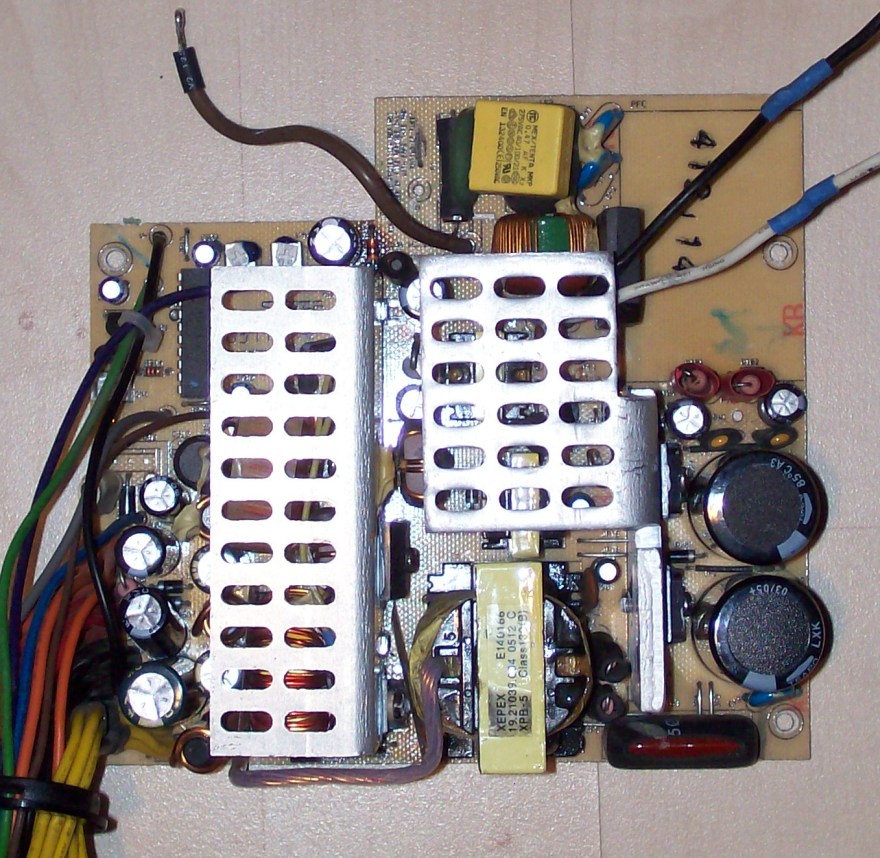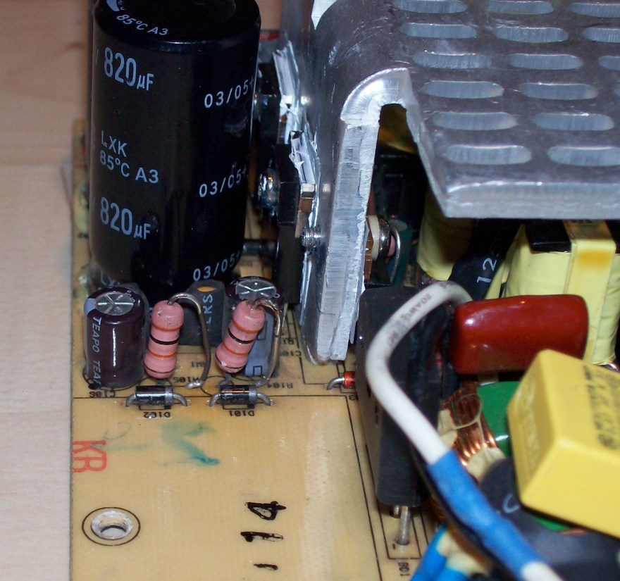 In the 5vsb circuit there is a 4.7uF capacitor bent right in top of a diode. In time the capacitor simply fries and the 5vsb voltage goes way up high. As it goes above 6.2 volts a zener diode gets shorted. After this the protection won't let the unit power up and the psu gives an audable squeal. That's all the info I aquired and since I got one of this faulty psu I decided to apply this simple fix, just to see if it works out. Someone definately tinkered with this thing before, but it probably didn't work. Anyway I replaced the problematic cap and zener, secondary caps. Checked primary transistors and fet and secondary schottky diodes too. All measured good.