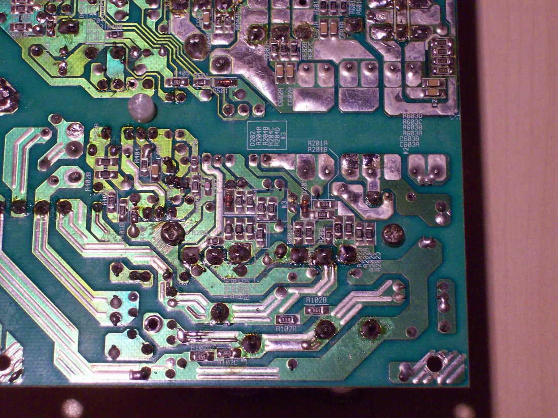 I noticed that this psu has several burn marks, one under the 5vsb protection zener and another next to the big transformer where on the R603 A B C D resistors are in paralell on the other side...