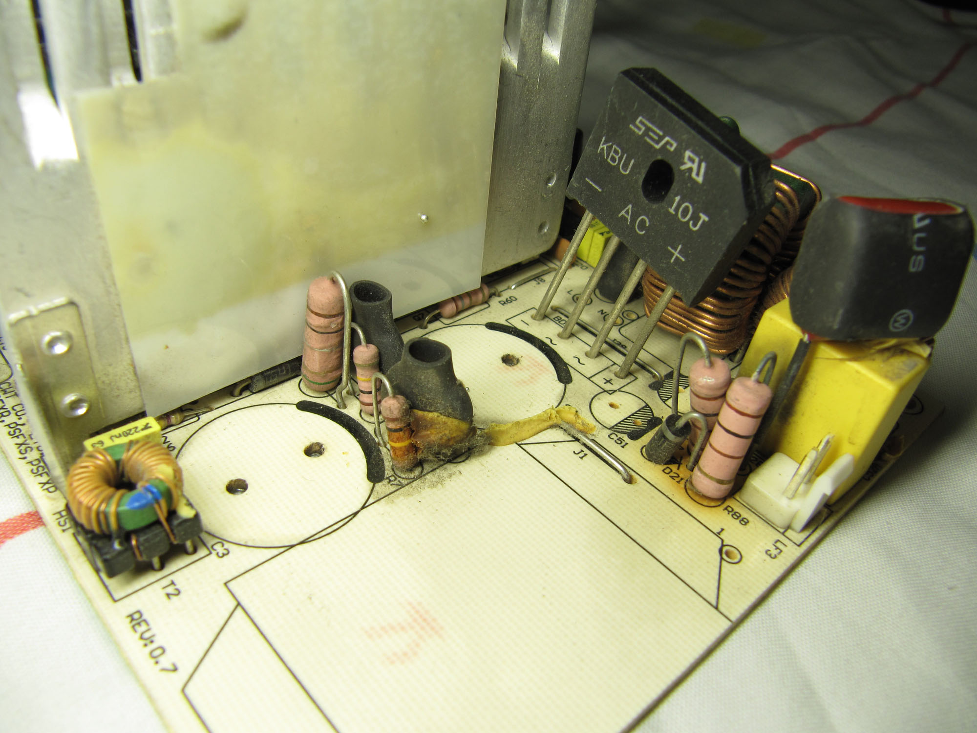 I think he removed the boost caps, which disables the boost circuit. I often do this to CWT PSUs. It's not needed and gets too hot. I doubt if the boost circuit would have caused the bleed resistors to fail, though.I love putting bad caps and flat batteries in fire and watching them explode!!