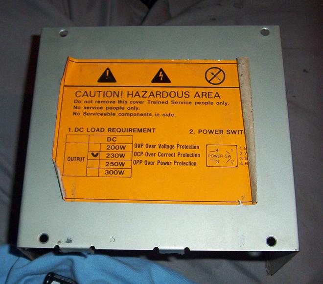 Here is the inside of the supply. Note the "DANGER High Voltage" sticker on the transformer and the "Yen" design of the heatsinks. Also note the caps. Oh, the caps.