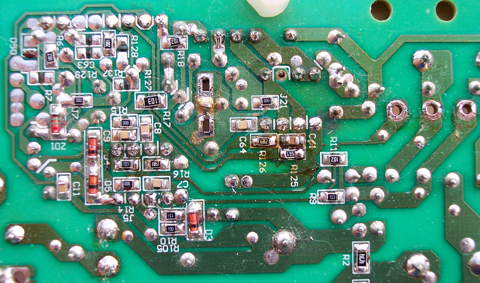 Brace yourself, this thing's gnarly looking up close. I took one inside the other day, but it wasn't clear enough. Keep in mind, some of this stuff is from all the desoldering/resoldering and my failure to clean the board, but that was all after the big explosion anyhow. IIRC, there were already a few "browned" areas when I started.