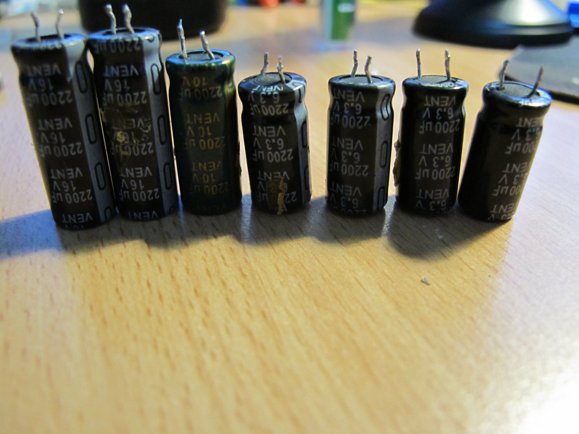 I've been getting strange instability inside my Atom based server with the video going fuzzy with this power supply recently, I've opened the power supply and marked the ones I think are bulging with black sharpie, seems like the 2200uf 6.3 v capacitors have gone bad, what should i replace these capacitors with?