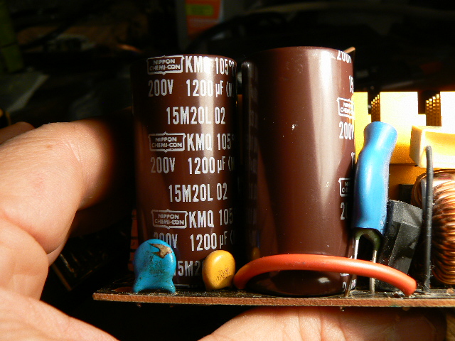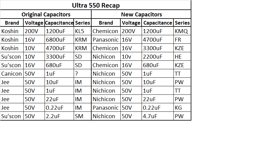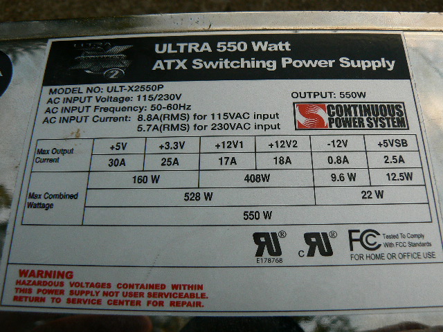 I have been going through my power supplies to see if they have problems since I have seen what happens if you wait until something pops. I remembered this Ultra 550 (ULT-X2550P) supply that I had in an old case. I pulled it out and found a main cap bloated. I also found the strangest arrangement of capacitors. You have to look at the pictures but they stacked two caps in the same space. The top cap has heatshrink on the legs of the cap.