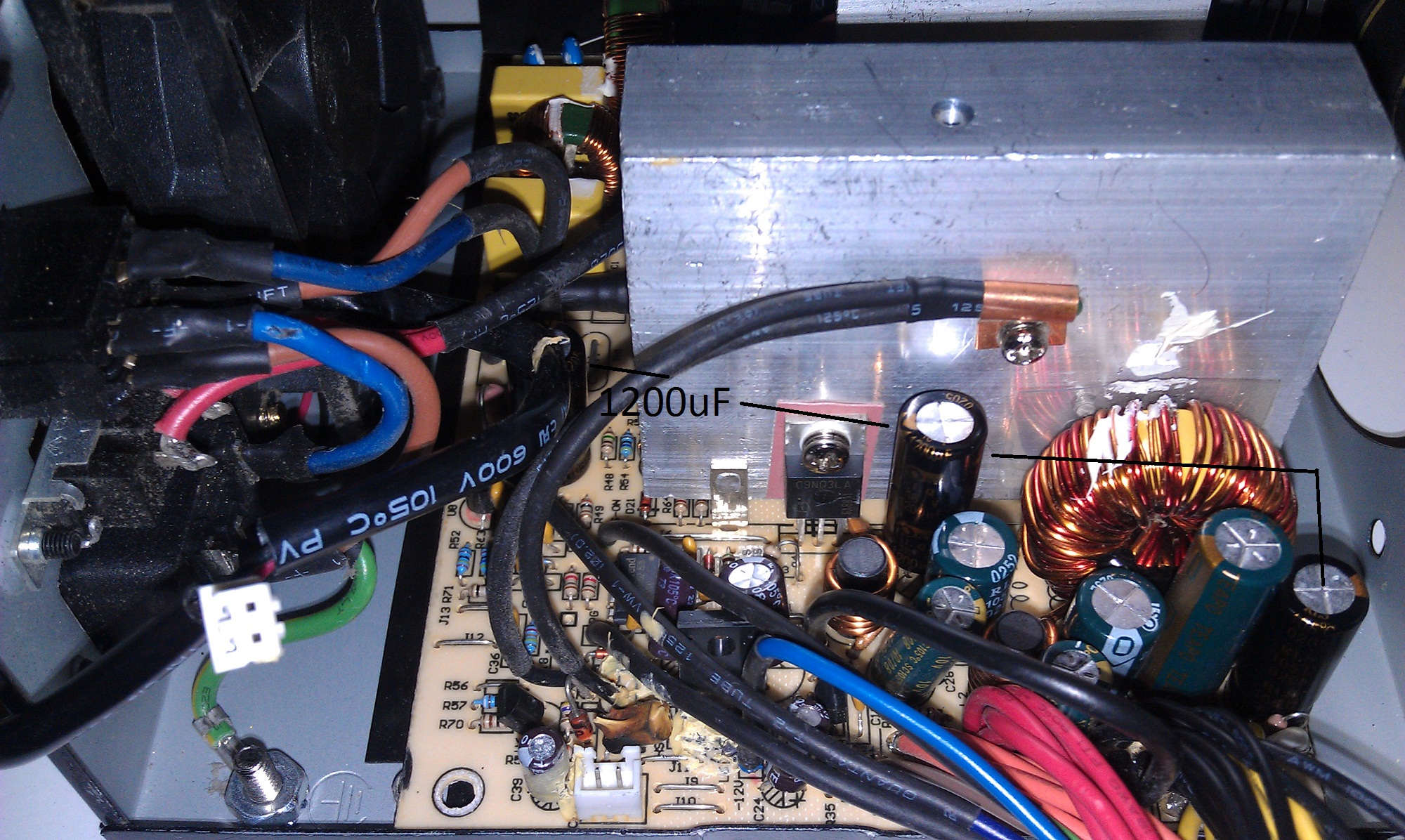 An old Huntkey 250W I had only had 1x2200uF/16V FCon GL on the 12V rail and powered an AMD Athlon 64 3800+ (85W TDP) and GeForce 8600GT/9600GT LP (50W/60W TDP) for years without a problem... and that was with a low speed, 80mm temperature controlled fan from Yate Loon. I dunno how it pulled that off. It had two 10A ultrafast recovery transistors from NXP (two BYQ28E-200s - a 200V block reverse voltage on both) on the 12V rail and it was half-bridge, though that still doesn't sound like a lot to me... it did have a pair of TO-220 13009s, though, as its switching transistors. And it also had toroidal coils on every output on the secondary.