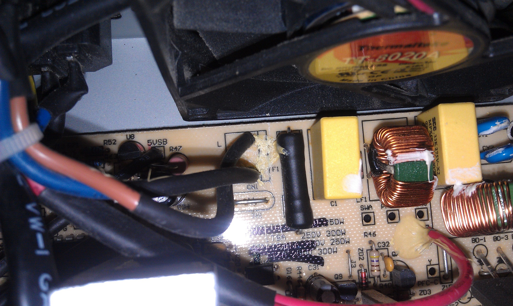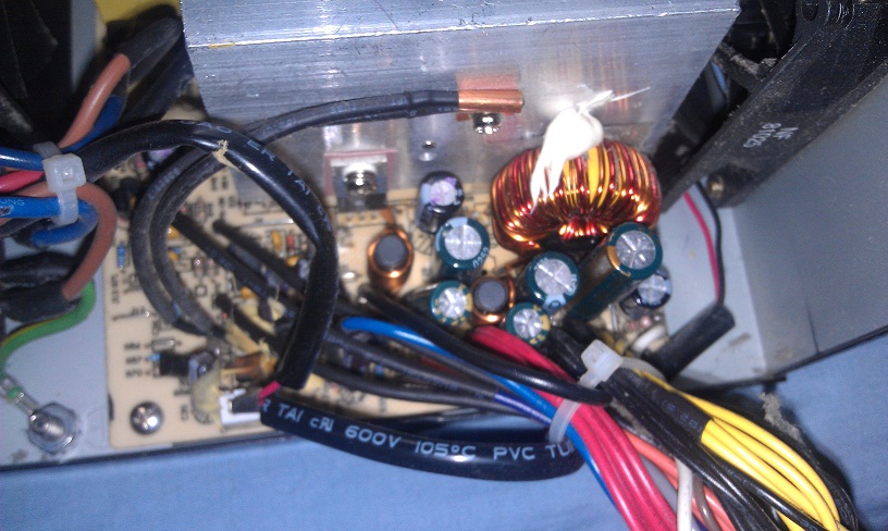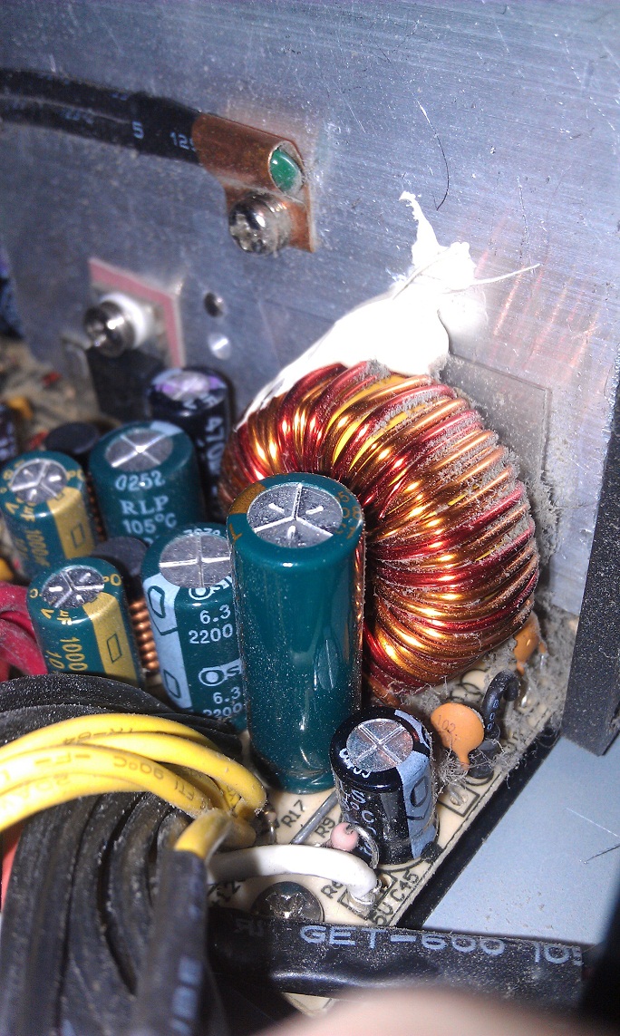 With good enough silicon, even 470uF/560uF primaries can do 350W, though of course we'd be talking about more heat output + 7x% efficiency. I think it depends heavily on the rest of the components, similar to how a 35 size transformer can do 500W with good enough components. It also looks like there's conductive glue near the 5VSB output; I'd recommend getting rid of it.