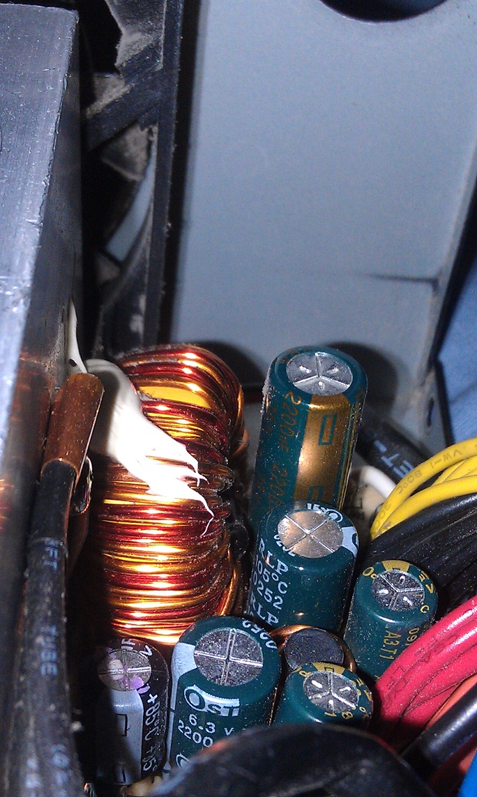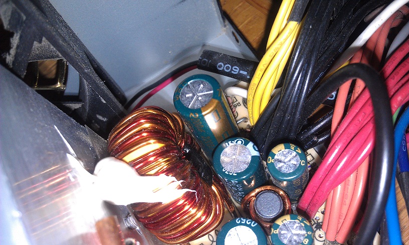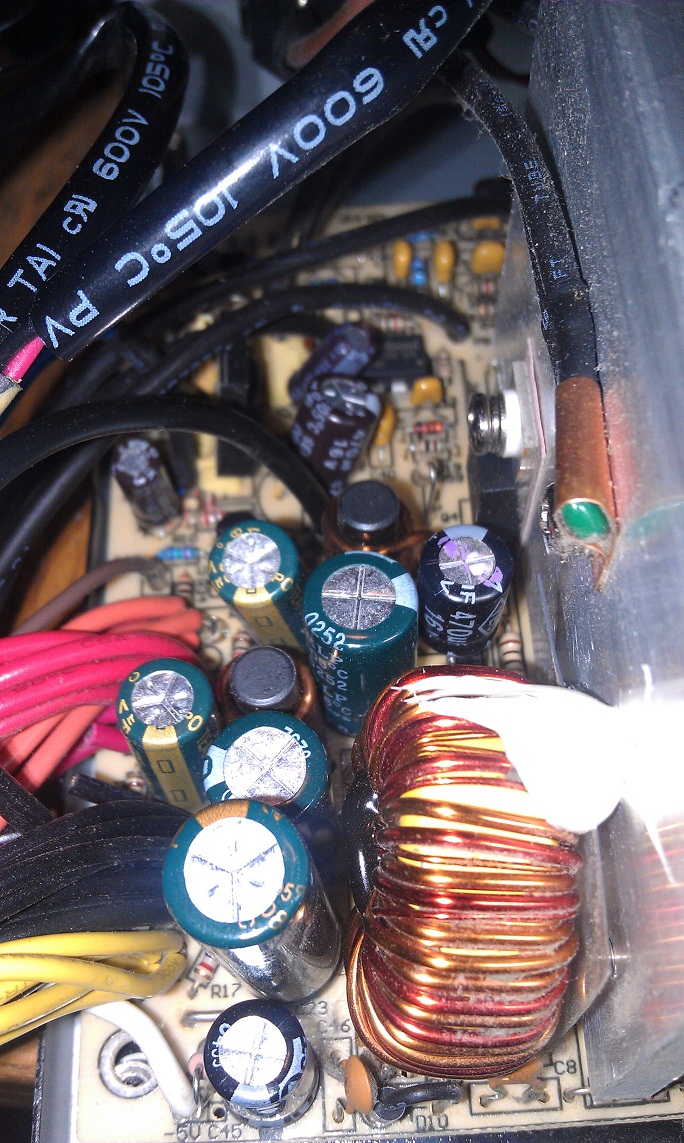 With good enough silicon, even 470uF/560uF primaries can do 350W, though of course we'd be talking about more heat output + 7x% efficiency. I think it depends heavily on the rest of the components, similar to how a 35 size transformer can do 500W with good enough components. It also looks like there's conductive glue near the +5V output; I'd recommend getting rid of it.