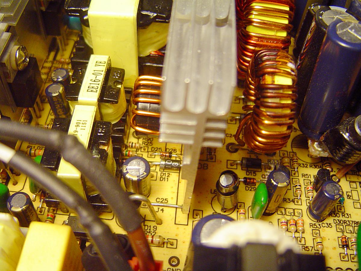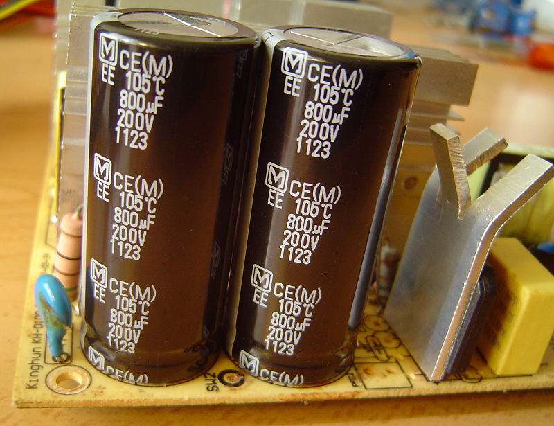 Smaller electros replaced with Panny FCs, and an extra ghetto-modded fan to let the air flow: