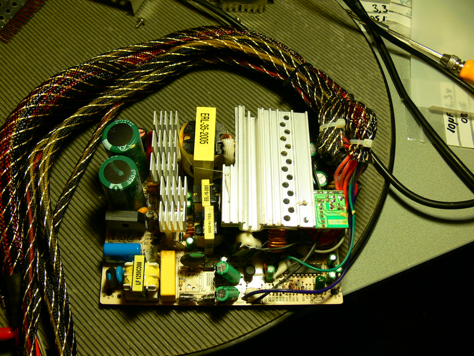 Yep, slapped that pair of Sanyos on the 5Vsb, a couple of Panny FK's on the 12v, and a pair of Ruby MBZ's on the inputs of the 3.3v and 5v pi-filters, and another pair of Sanyos on the outputs. I know, i know, MBZ's might be a bit too low-ESR, but i didn't have anything else low-ESR at 2200u in 10mm cans (and i figured going down to 1500u wouldn't have been too good, for the pi filter inputs)...