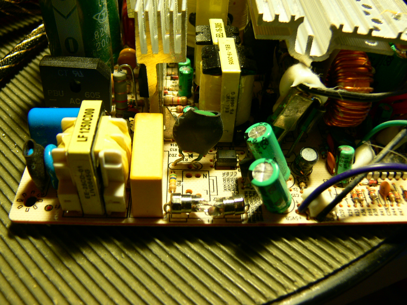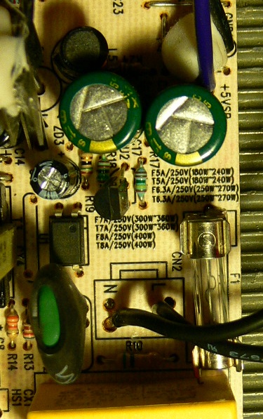 After removing the board from the casing, first step was removing the fuse (see picture no.1), and soldering in a pair of those metallic fuse holders. Popped in a 6.3A fuse, and hooked up the whole thing through a bulb-tester. No flash, no nothing; measured the 5Vsb, meter said 1.8v