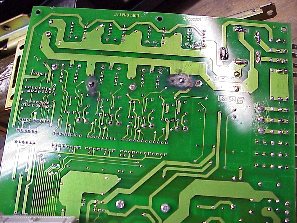 Looks like a couple of cracked solder joints with arcing from the pads to the component leads.PeteS in CA
