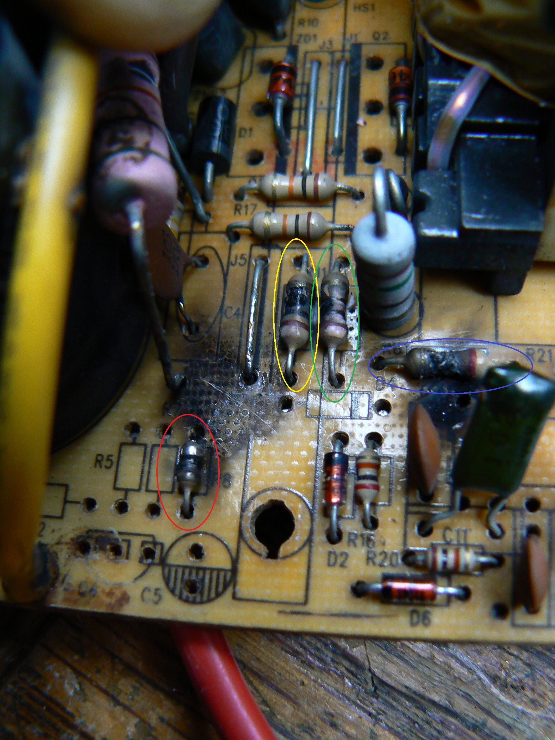 R8 which is circled in red is the one I have no clue to its' value. I think the two resistors circled in yellow and green are both 10 ohm resistors. The resistor circled in blue I think is a 22 ohm resistor.