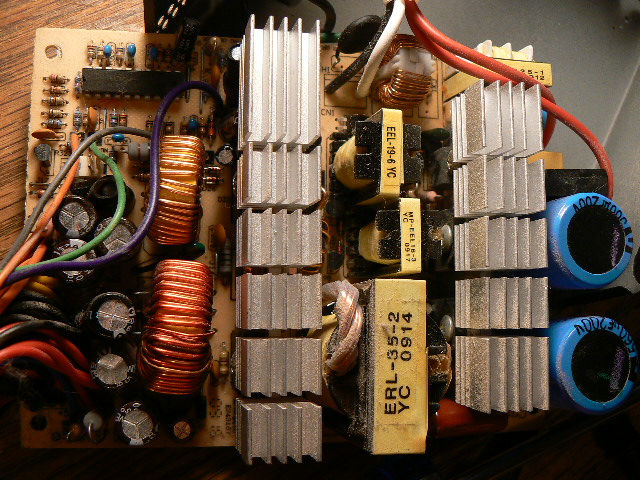 ^ That's a 500W PSU? It only has 560uF input capacitors in a half bridge configuration... I think 300W continuous is a more realistic limit for it (maybe 350W at the most?), even with an 140mm fan...