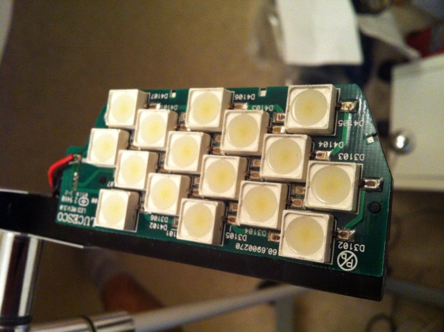 However, the power to the lamp head seems insufficient as only one half of the LEDS lights up. There are two rows which must be in series. I get -2.7v on the working ones and -500mv on the ones which do not light.