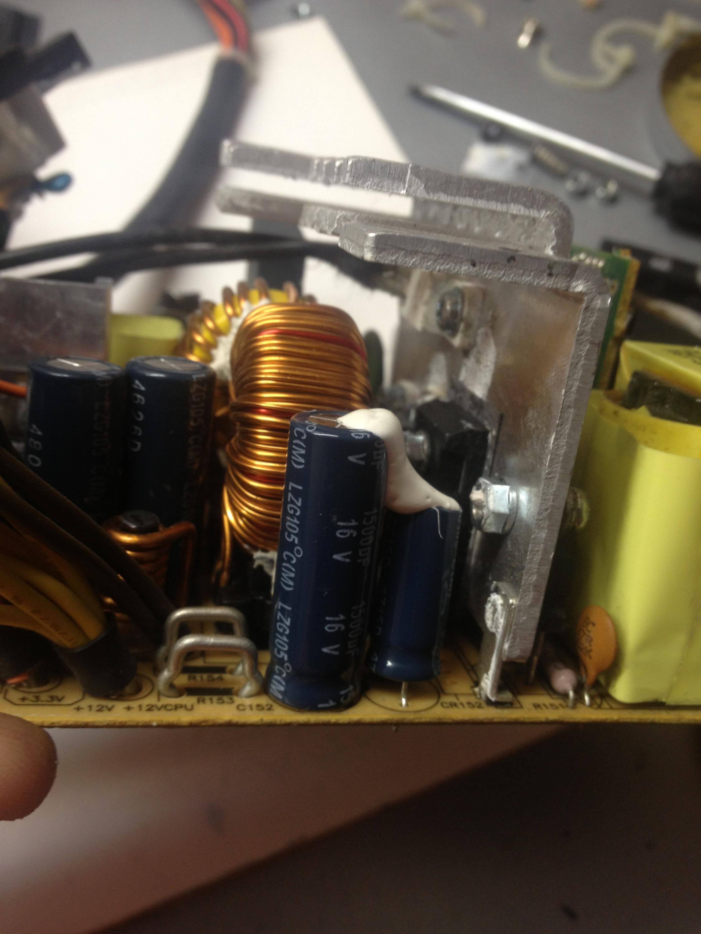 As to the discolored area near C16 on the riser: this is right behind the PFC inductor on the PS main board. As usual, such inductors are undersized (both copper and core) and run hot. They sometimes develop shorted turns, which destroys the PFC MOSFET.