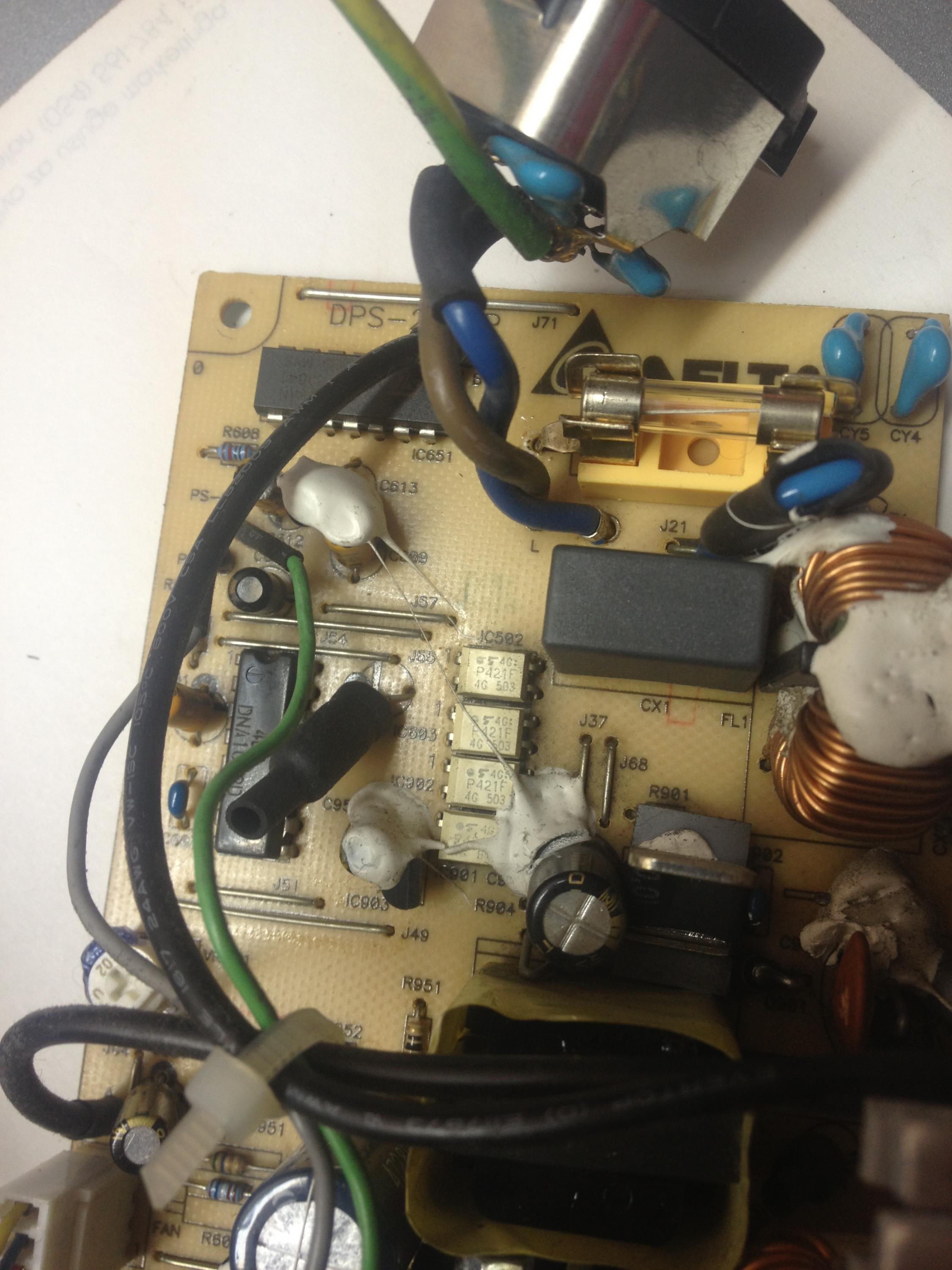 Or, the PFC output cap (330-820u, 350-450V) gets high ESR or opens. Now, the energy stored in the PFC inductor has no place to go. The boosted B+ voltage rises when the PFC MOSFET shuts off (dI/dT) and keeps rising, until the PFC MOSFET, and sometimes diode, are destroyed. At this point the line fuse is blown, the gate driver has been backfed, and NTC (if present) is cracked. If unit is overfused, the line rectifier can short, too. This can all happen before the SMPS PWM even starts!