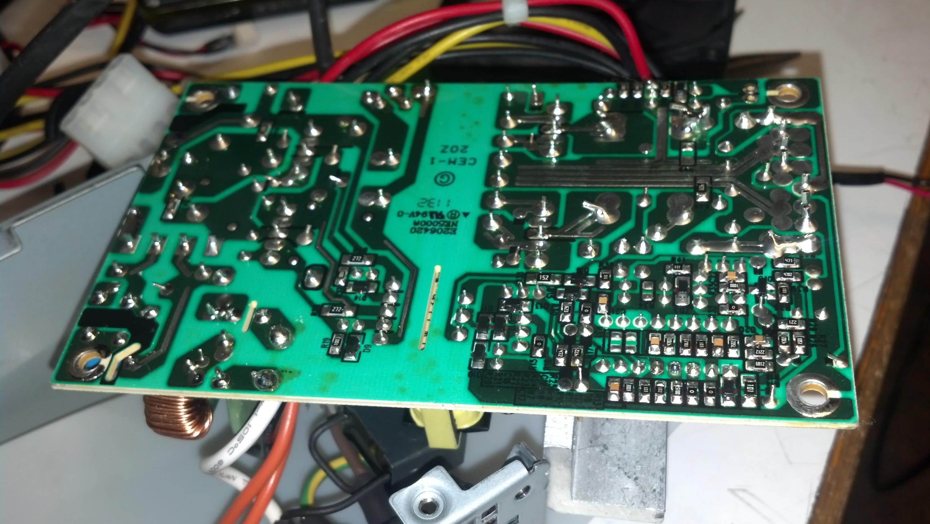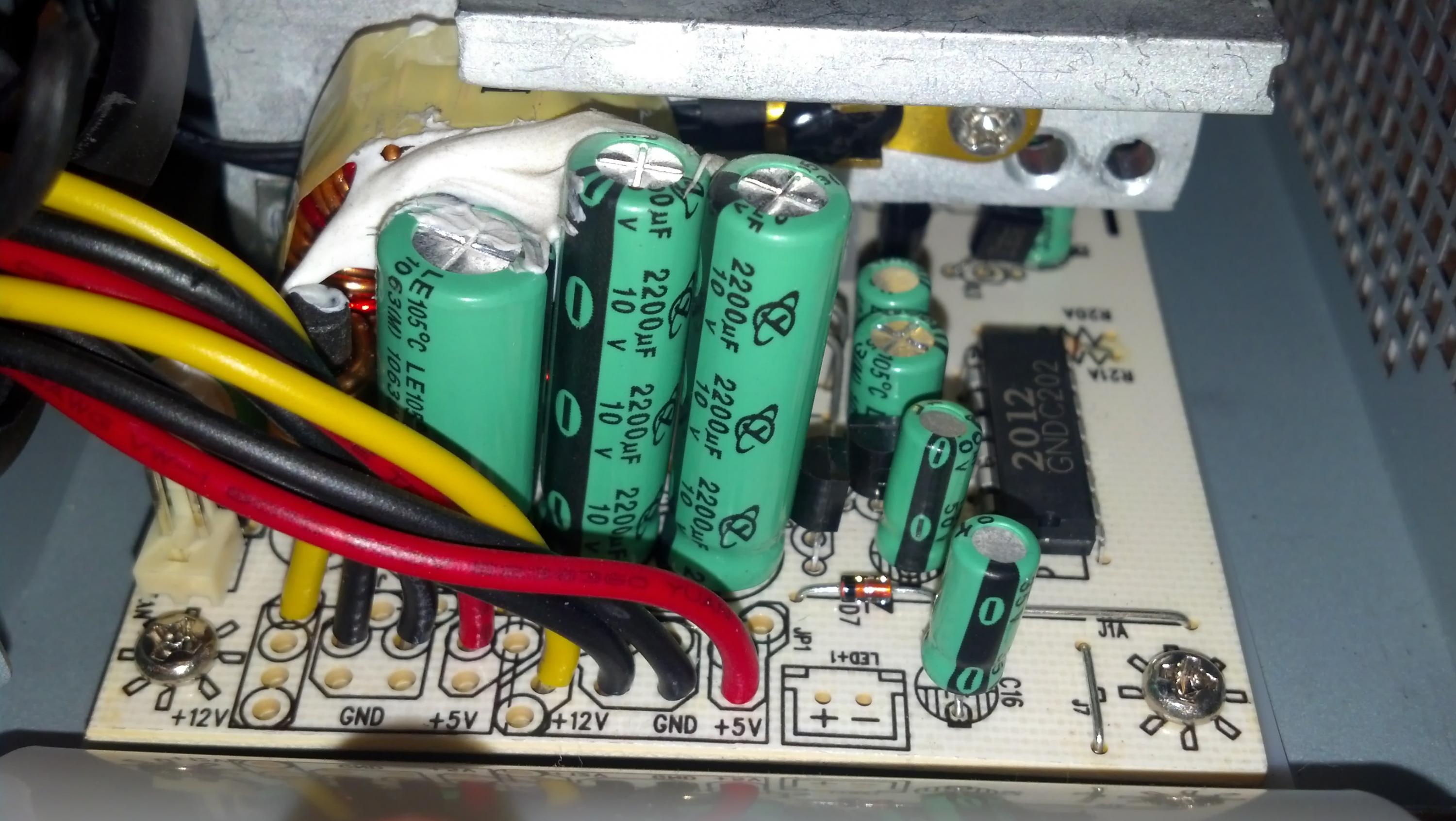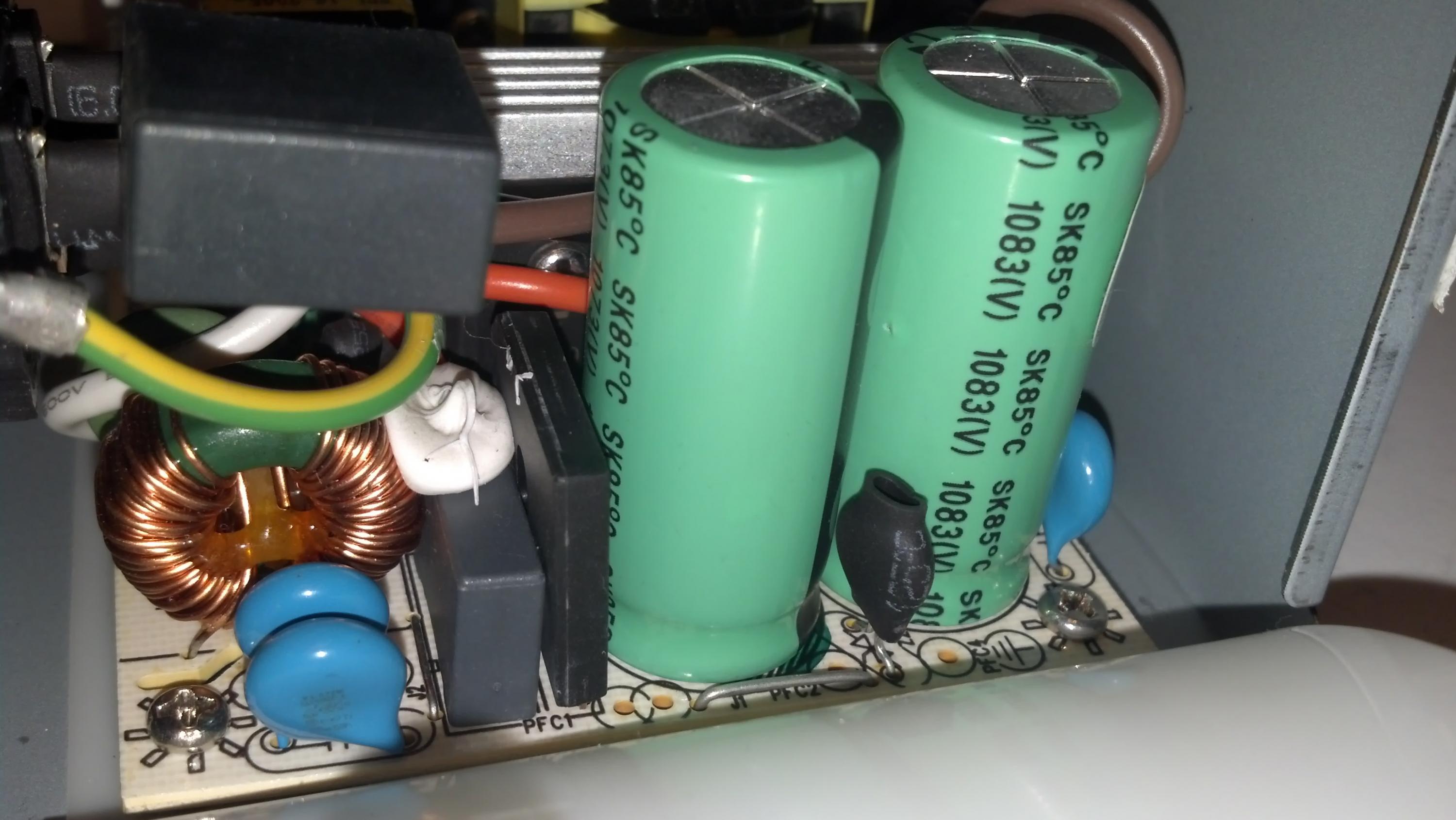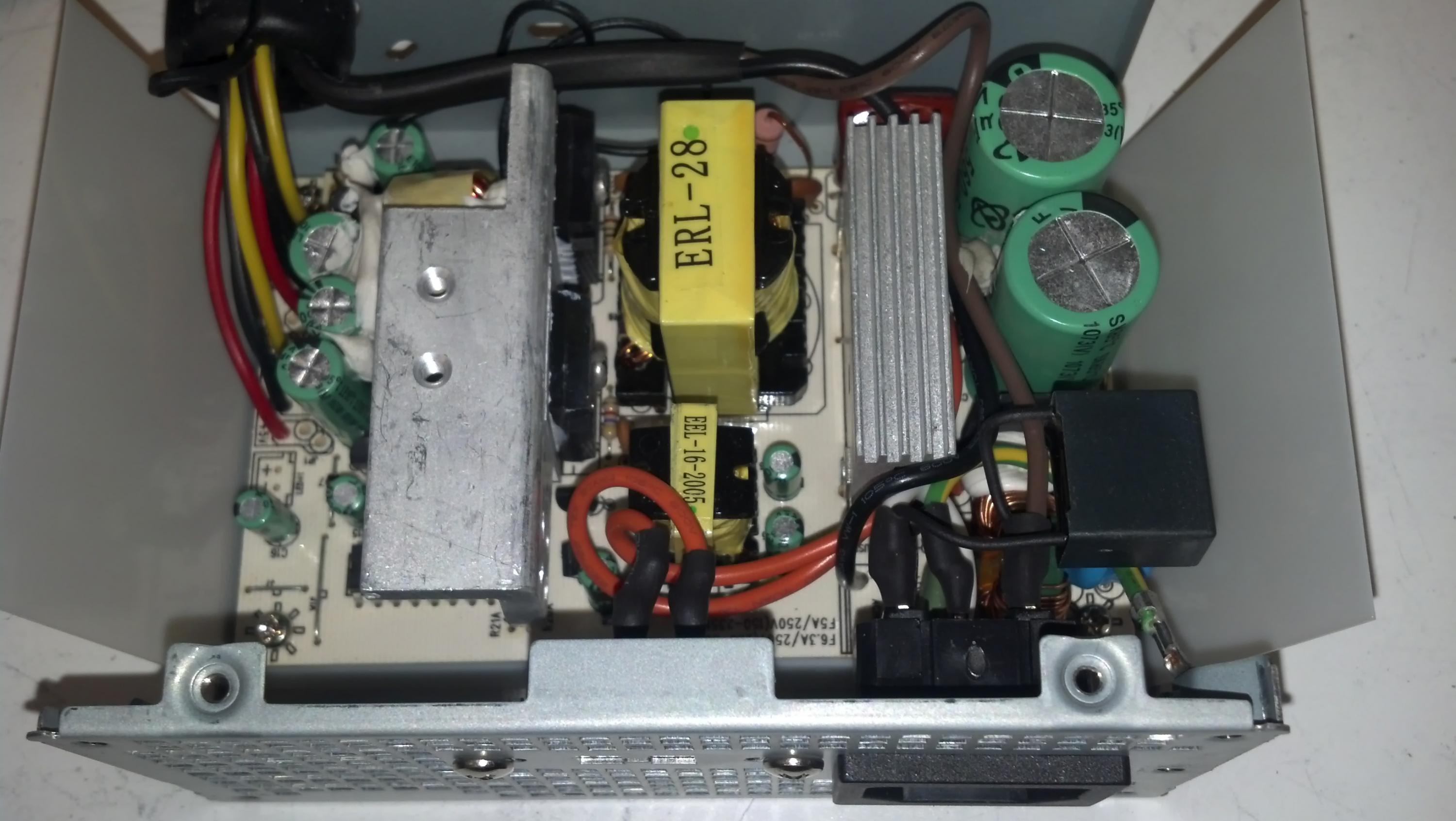 Decently well made for its role, 4A bridge, 560uF input caps, 13009 switchers, 30A TO-247 schottky for 12V and 5V. Too bad the fan sucked....I replaced it with that Protechnic fan, no clip so I just soldered it to the board