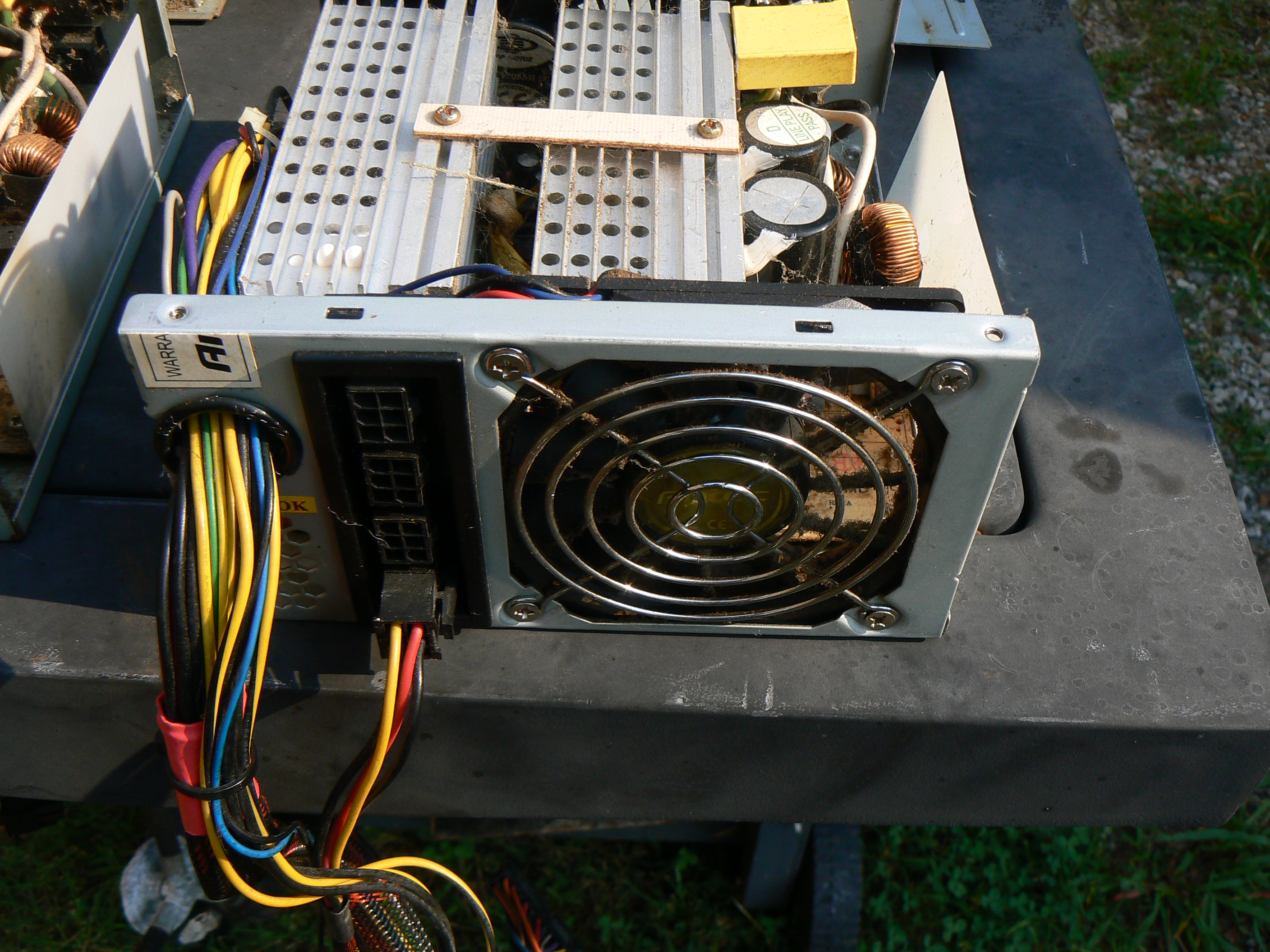 In my search for a proper 5v heavy ATX power supply, I selected an old Antec SU-380 that I've had in storage for a long time. Opening the power supply reveals a couple bulged capacitors. I removed all the caps and made a map for myself. I found the datasheet for the PCE TUR series in this thread: