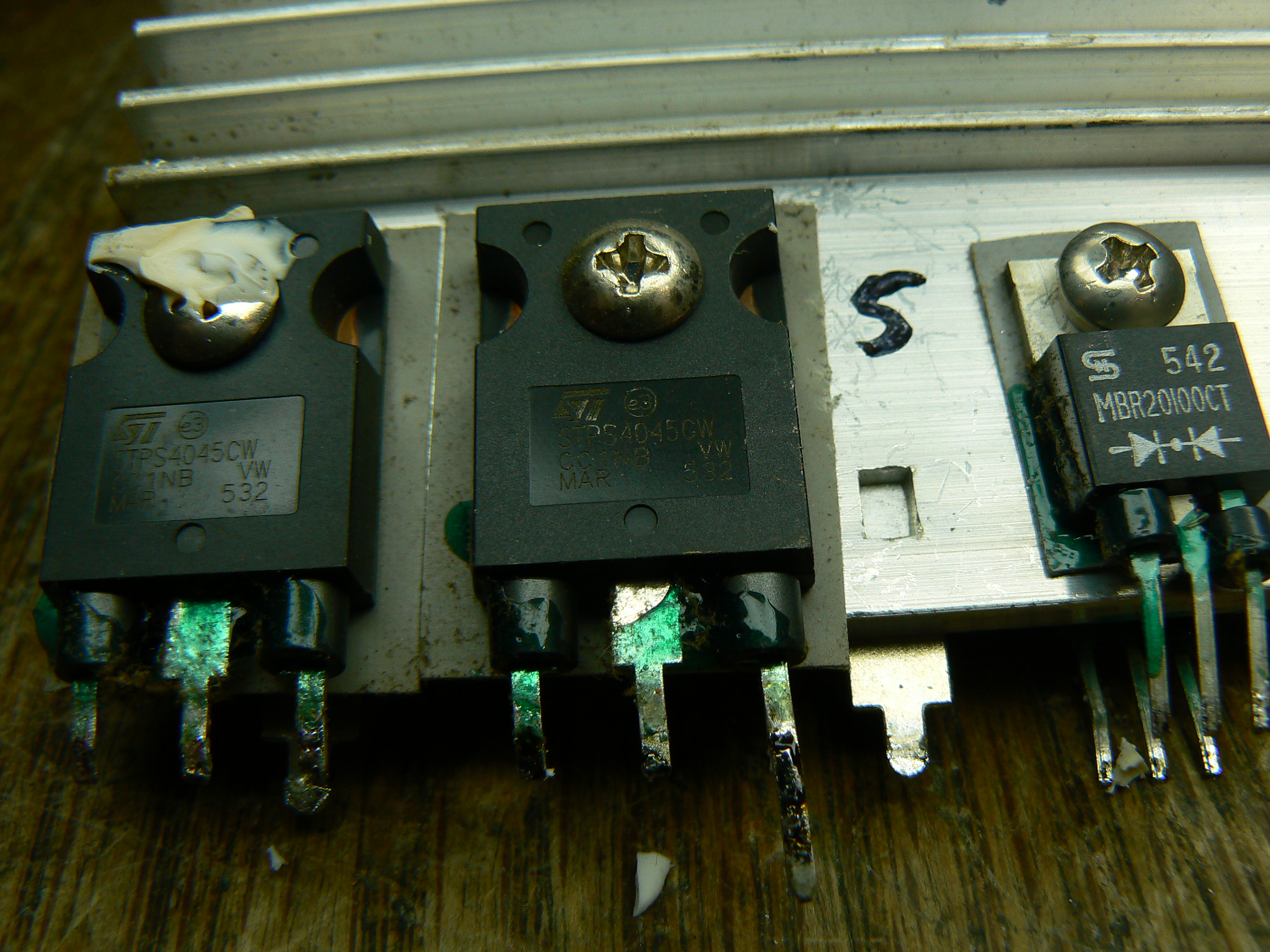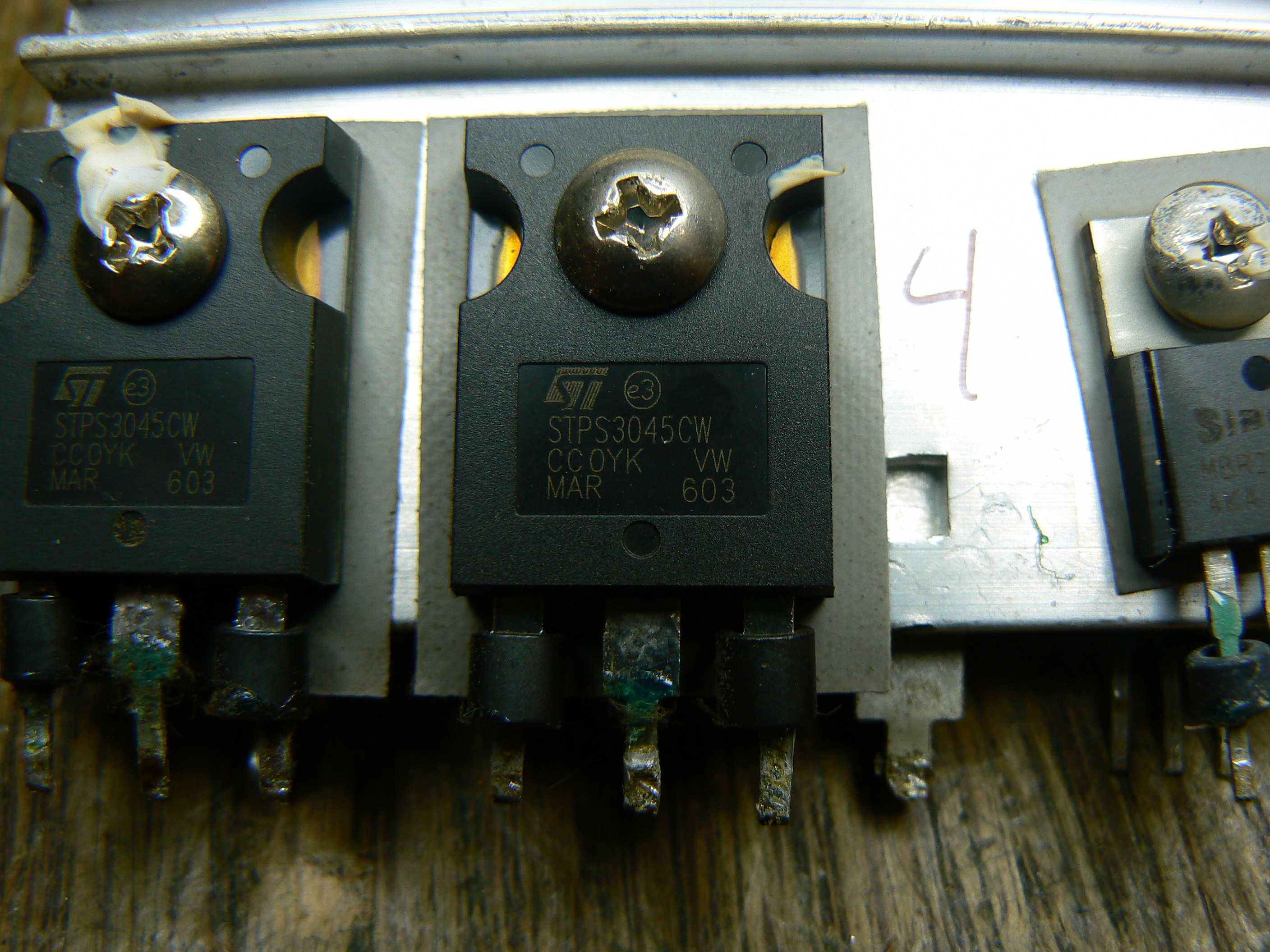 The diodes on the secondary are STPS4045 rated at 40A@45V for the 3.3V and 5V. For the 12V they went with two diodes, MBR20100 each rated for 20A @ 100V. According to the label, the total Amp rating for the 12V output of this supply is 36A so there is not much of a margin for error.