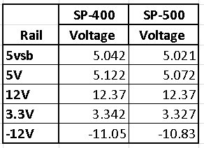 I also tested the operation of the SP-400 as I had the SP-500. The 5vsb was not stable by any measure, it was making my meter go a little nuts, I mostly recall it reading 2.63V. The power supply was also powering off and on continuously when power was applied. Pressing the on button of my ATX tester surprisingly would turn on the supply, releasing the on button would cause the supply to once again cycle on and off. Like the SP-500, when the supply was on, the three main voltages were good.