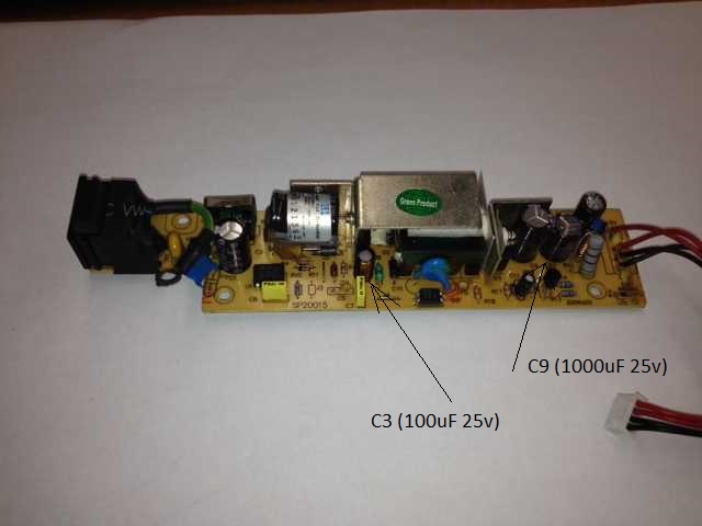 We use a lot of Neoware thin client and from time to time, the power supply stops working. On older models, the problem was easy to spot: 2 blown condensers (1000uF near the connectors). But on later models, no clear evidence of defective condenser can be see. By pure luck, I found that the C3 (100uF/25v) needs to be replaced, even if it looks OK.