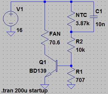 I'm guessing the "FAN" resistance is just its rated voltage divided by its rated current. Feel free to play around with the values in LTspice though