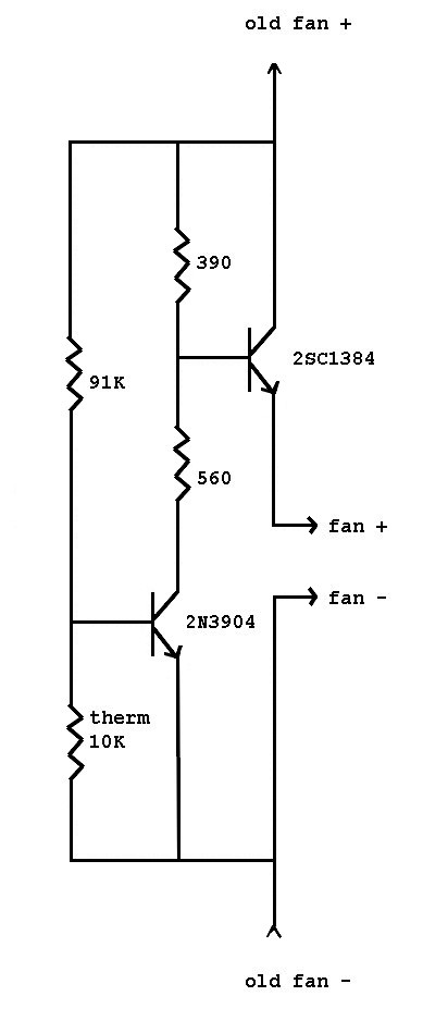 "... The thermistor is connected in a voltage divider, so that as its resistance changes, the voltage at the input of the op-amp changes. The non-inverting input is connected to a potentiometer to set the reference voltage, which effectively sets the lower limit on the fan speed. The output voltage follows the difference in voltage at the two inputs. The output is connected to a small transistor which is darlington-connected to a power transistor that acts as a current amplifier, which drives the fans.