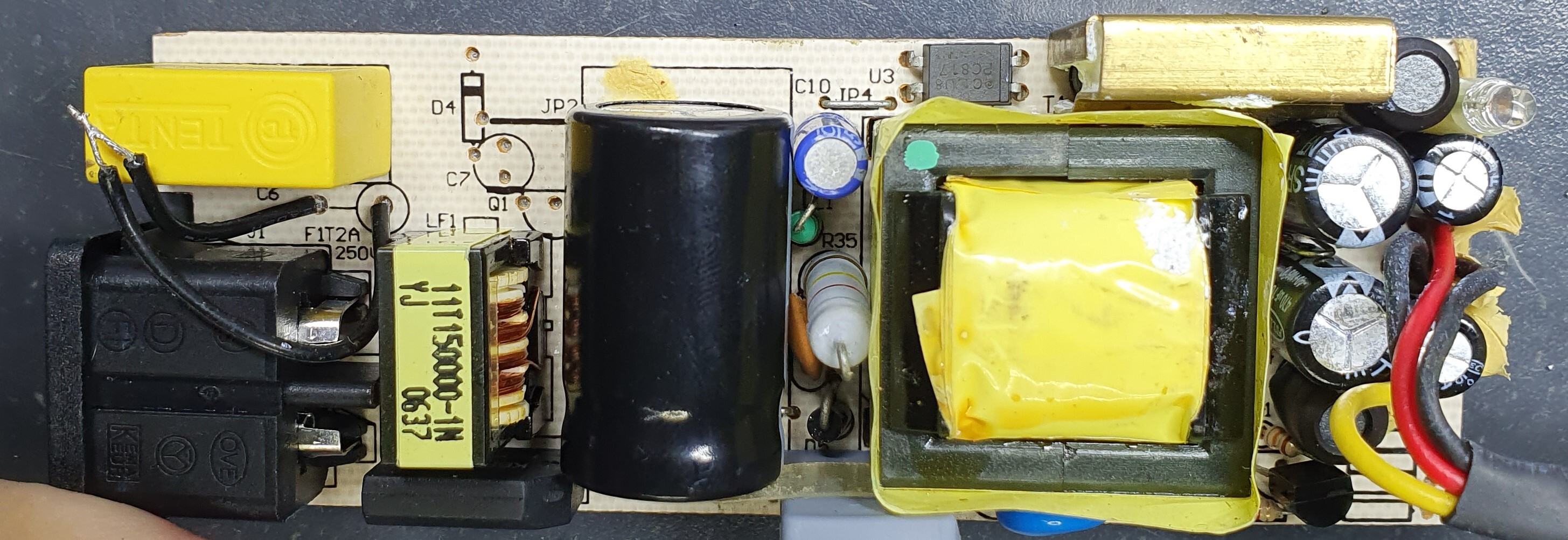 Where I stand now: running it in series with a 25w bulb on the mains side, as usual, produces the correct output voltages (12v and 5v), but the bulb glows too much, hinting it's drawing too much current. I tried it without the bulb just to confirm and it indeed blew the fuse. Thankfully, it didn't kill any parts, so it wasn't a violent current draw, but not functional either.