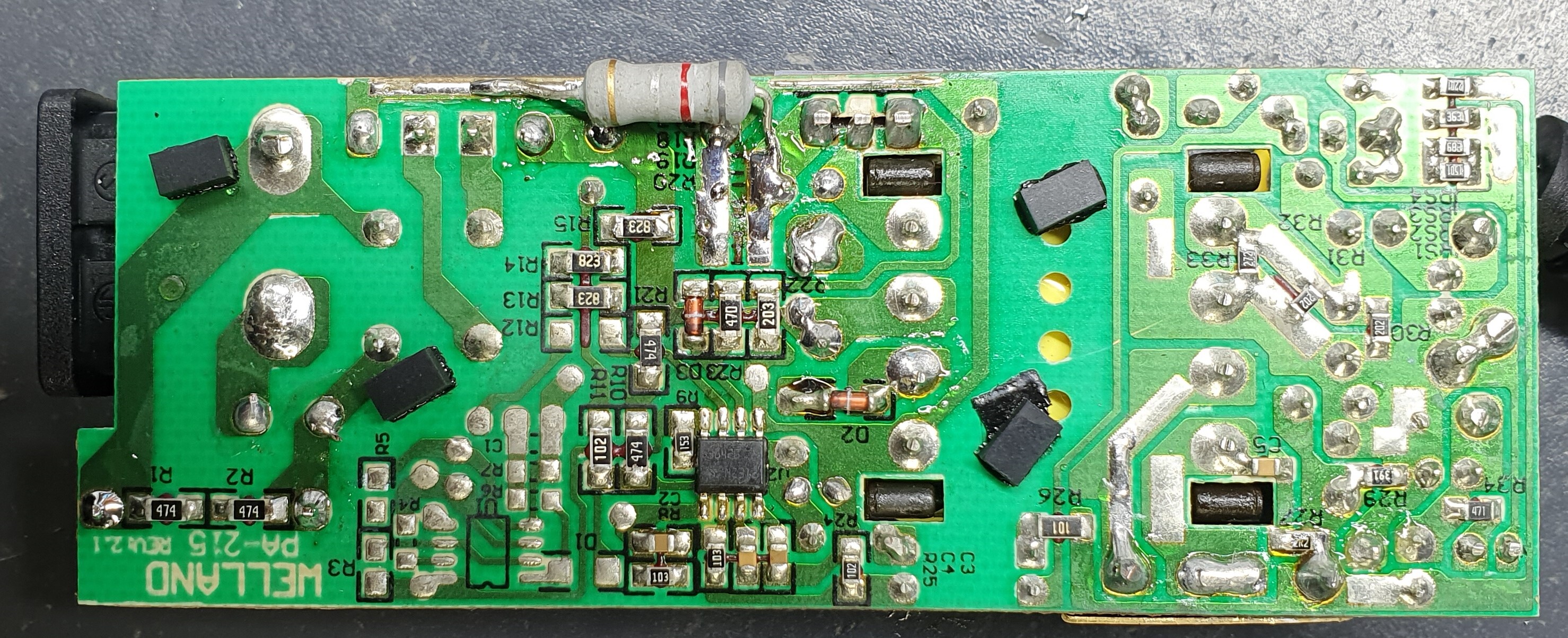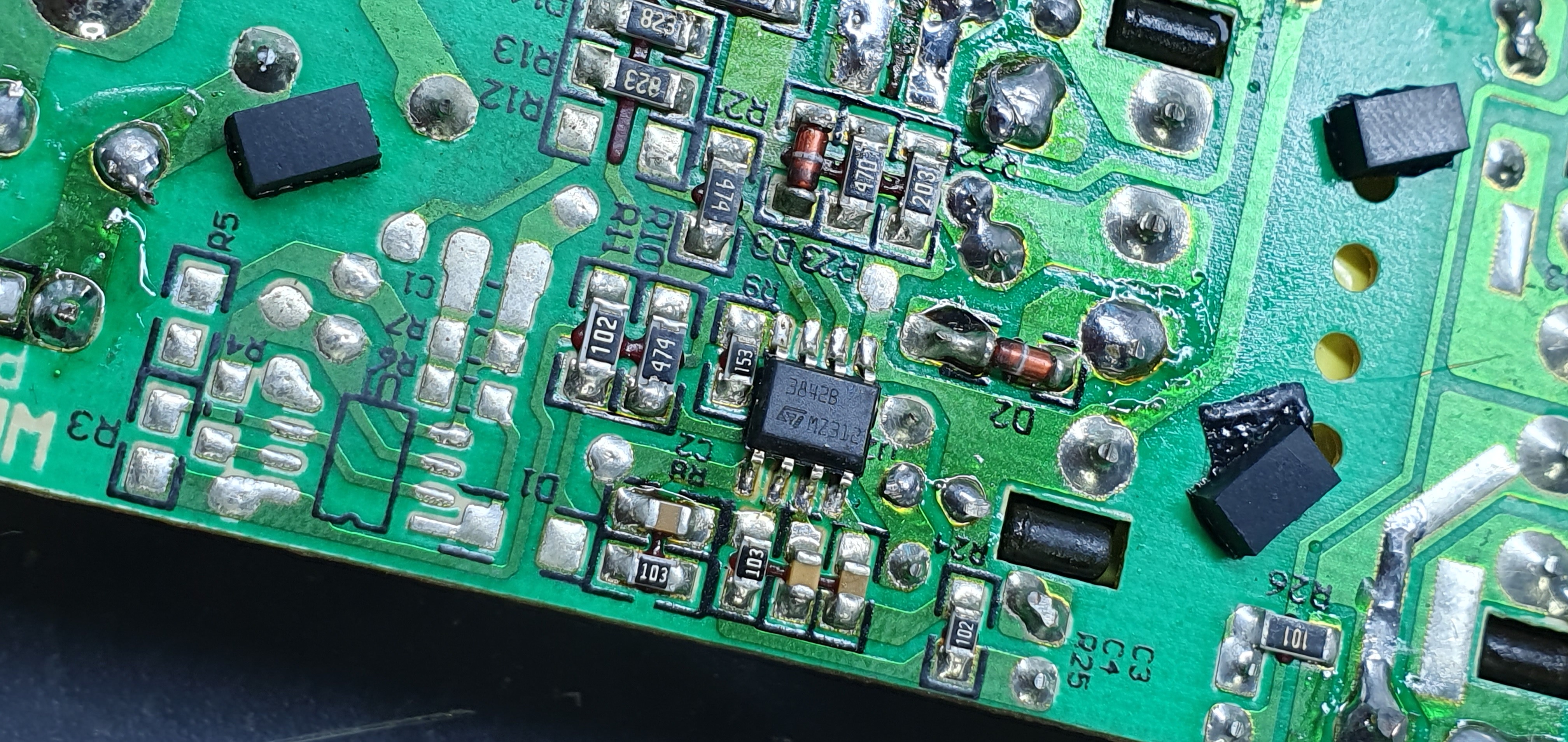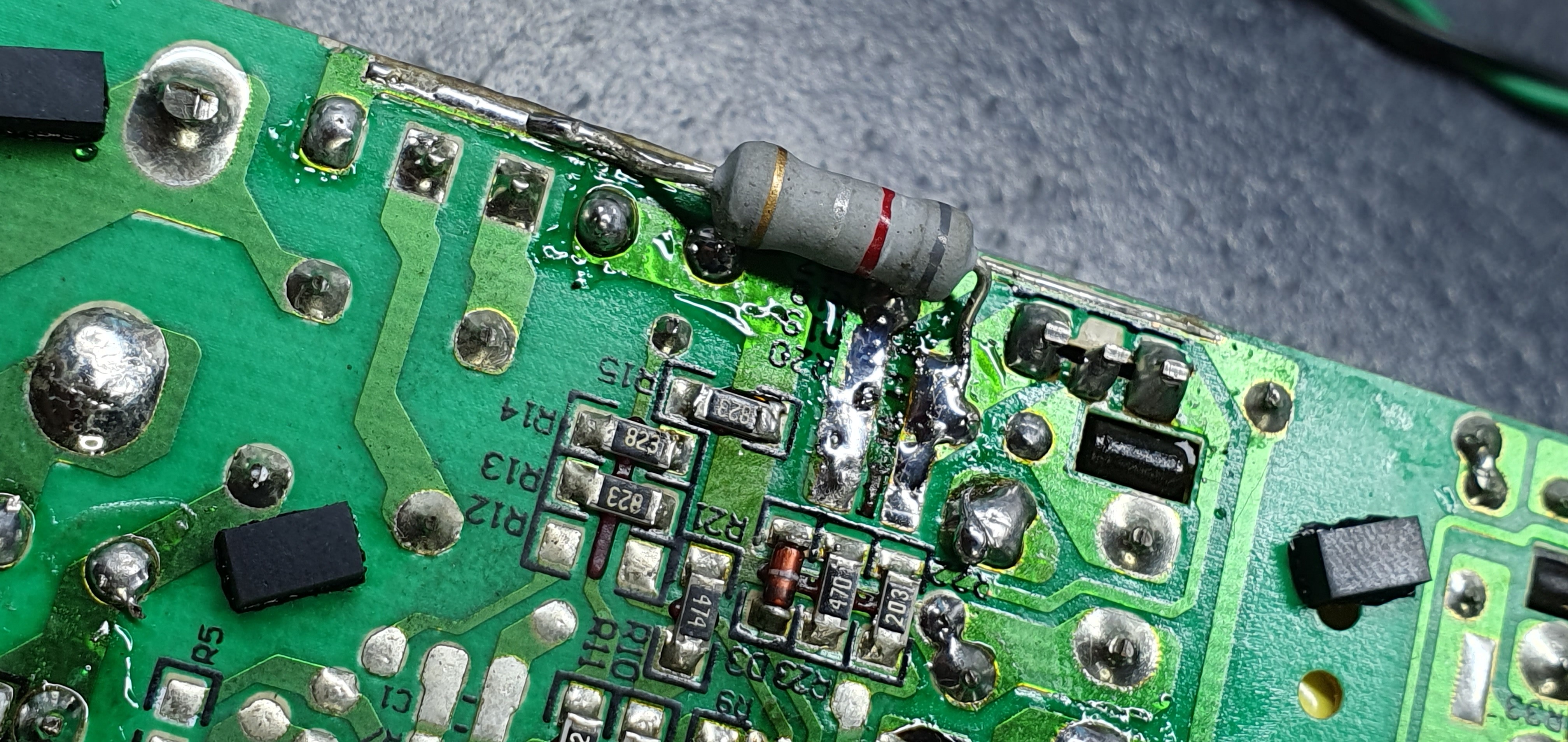 It seemed simple at first, but ended up being a rabbit hole: what happened is I shorted the output for a few seconds by accident on a metal surface. I noticed the LED was not coming on and I began investigating, but by the time I noticed what the cause really was, I heard a small "poof" and that was it. Cracking the case revealed 2 (or 3, not sure, since one may have been completely pulverized) destroyed current sense resistors on the source of the FET. Although they were charred, they were still decipherable - 2R2, so 2.2 ohms each. The FET and IC were also dead. I didn't have the exact transistor on hand so I used something equivalent out of my junk bin. Same goes for the resistors: didn't have them, much less so in SMD form, so I botch-soldered a single 0.82 ohm one on there hoping it'd be close enough. Output diodes were also shot - replaced those too....this was getting out of hand at this point, but I pushed on nonetheless.