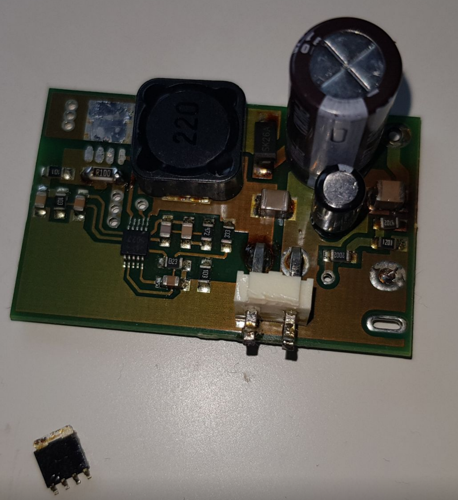 Whoever designed this device felt that this little board was capable of acting as a reliable buck converter from 48v to 40v at 1.2A, but all models for such spec that I've seen online are much larger and have heatsinks. To make matters worse we can't even identify the mosfet model used