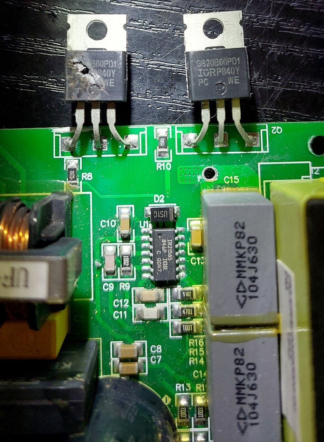 The original mounted IGBT where marked with IRGB20B60PD1PbF and the gate driver is a IR2156STRPBF.