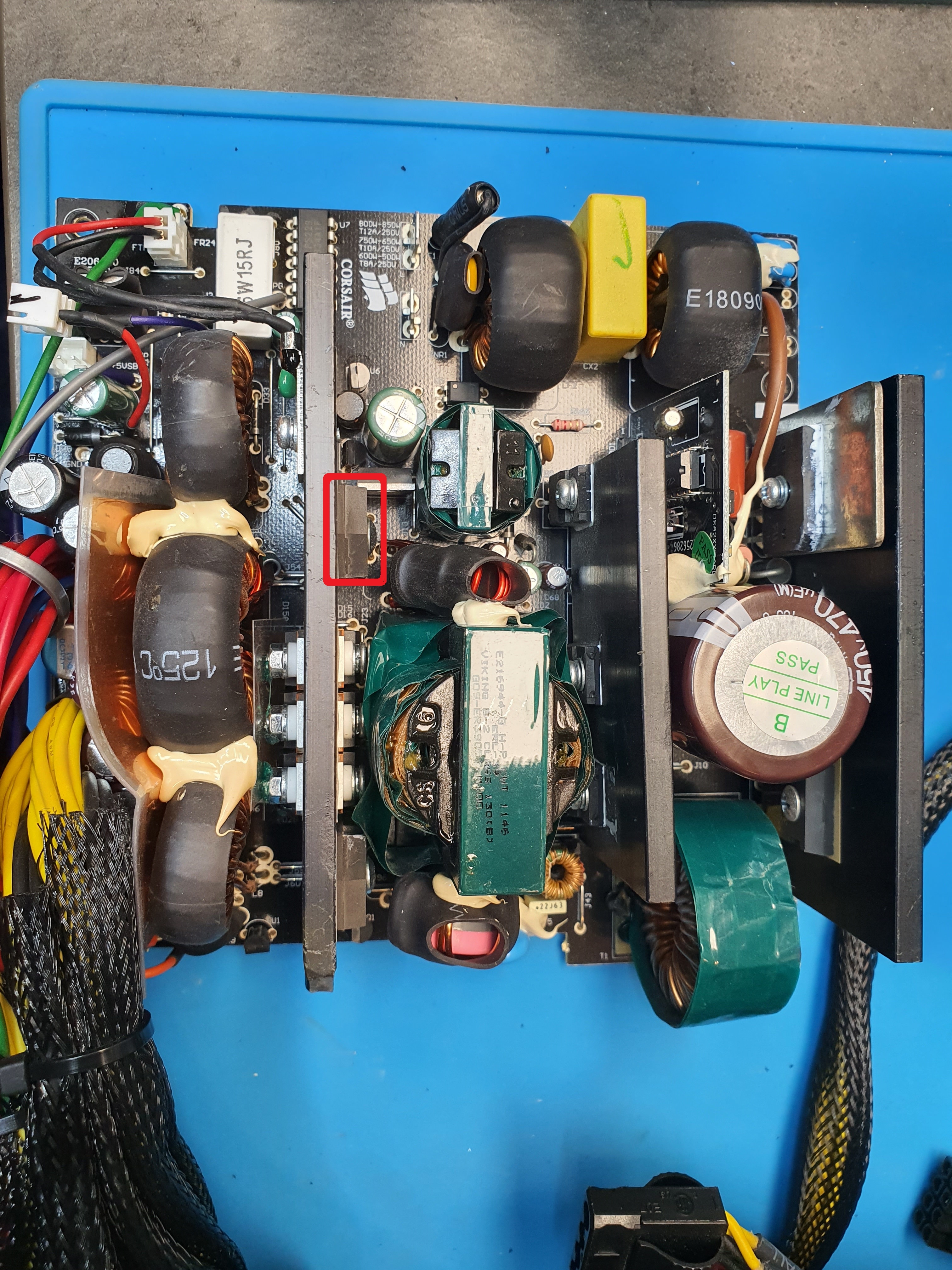 I'm trying to fix a Corsair CX500 ATX Power supply. It works fine with no load or with a couple of devices connected but turns on for only 0.5s in the motherboard. I've tested the motherboard with a different, lower wattage rating PSU and it works fine, so I know that isn't the issue.
