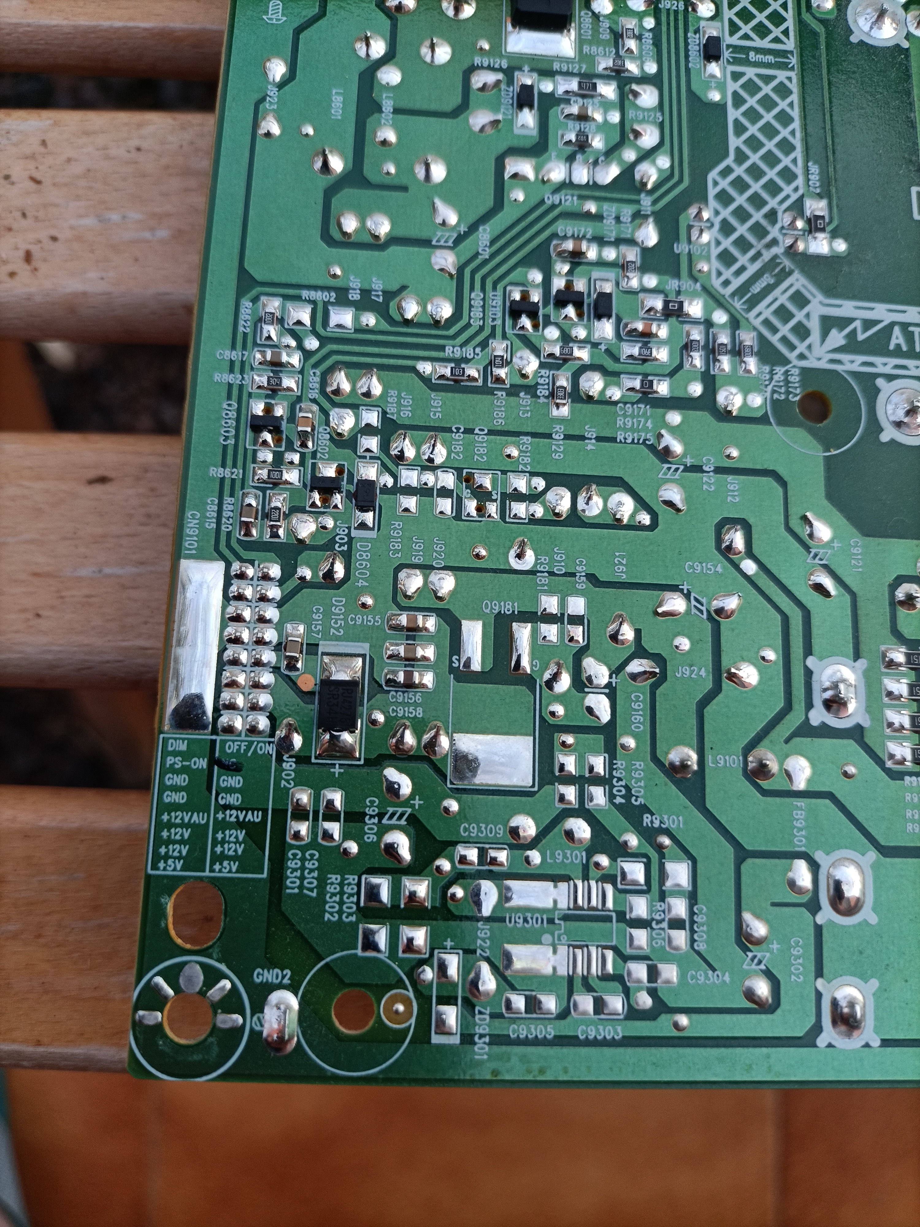 The TV is dead, there is no standby light, however there is a voltage of 12v on the pins ( included 12v VAU ) and 3.2v on the PS-ON pin (see photo) when the power board is connected to the main board. If I disconnect both boards I only get 8 volts on 12v pins. I would like to rule out a fault in the main board by making it work, but so far no one has been able to tell me how to bridge the correct pins to power this power board separately.
