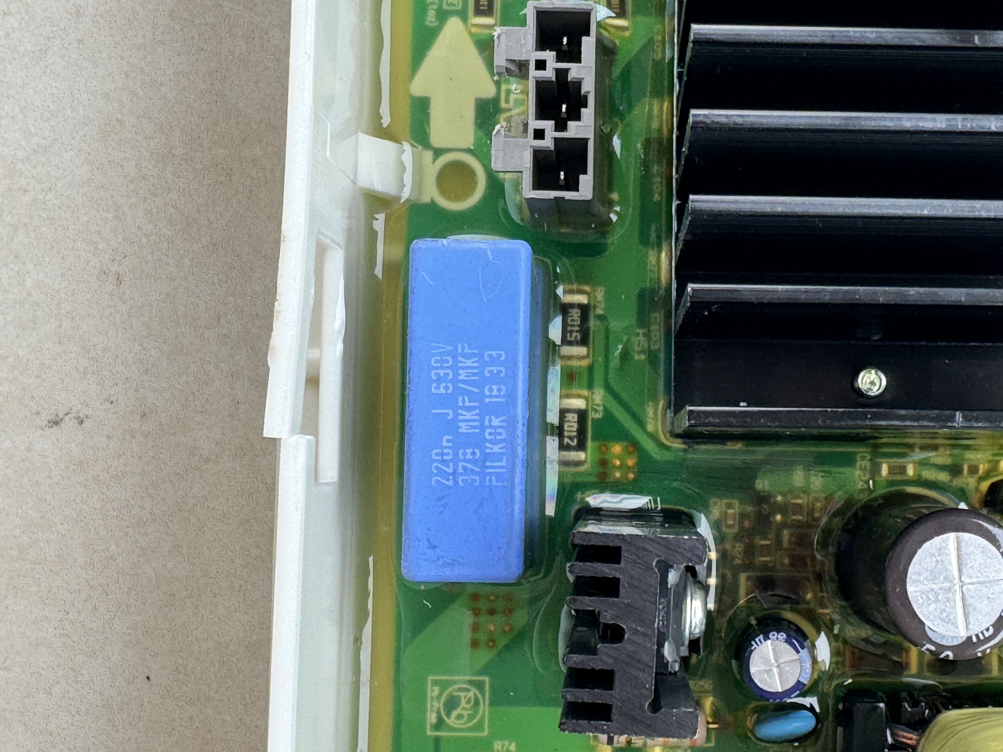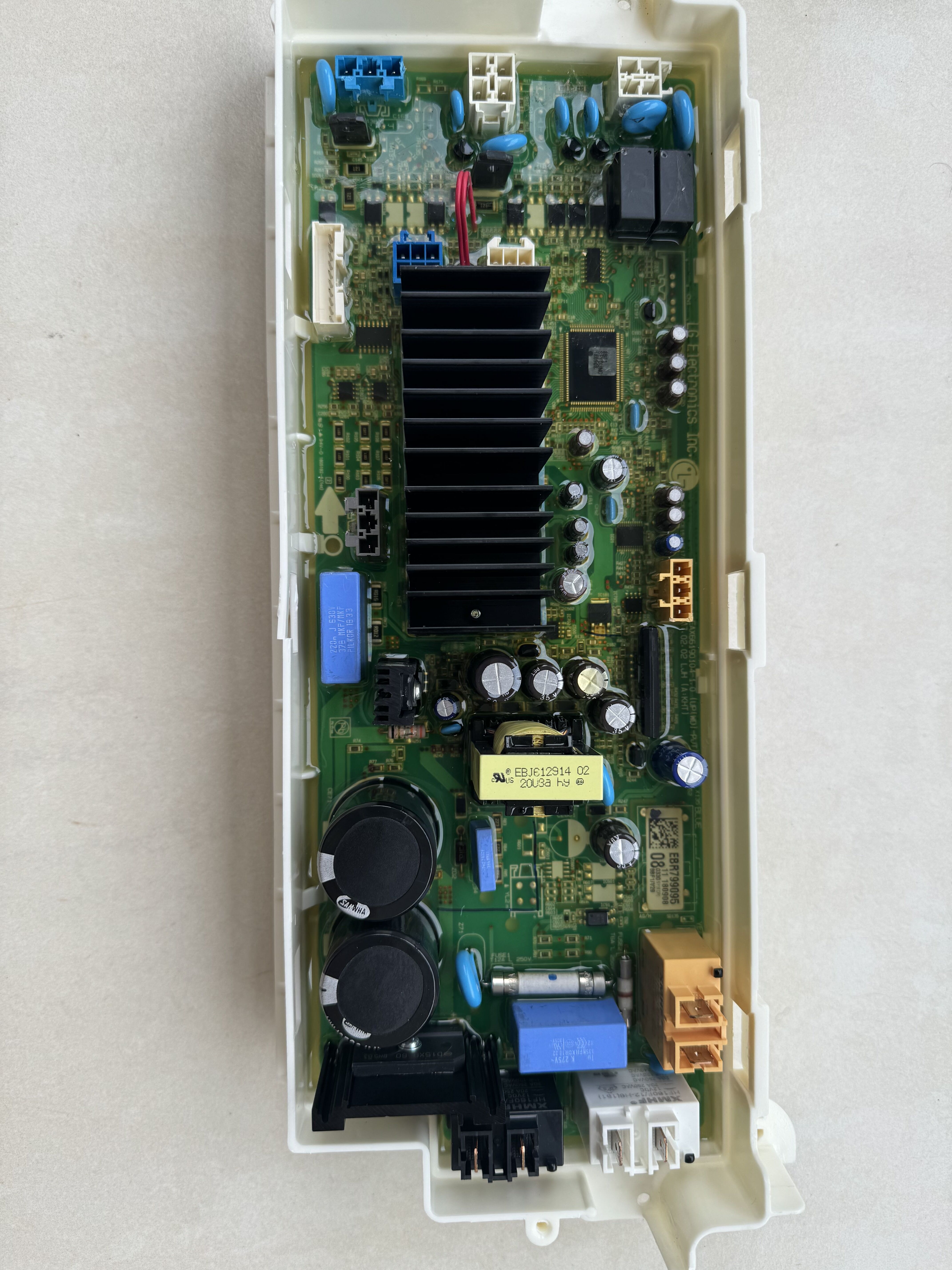 The main board of this LG washing and drying machine was damaged due to overvoltage. It is rated for 127V and was powered on 380V.