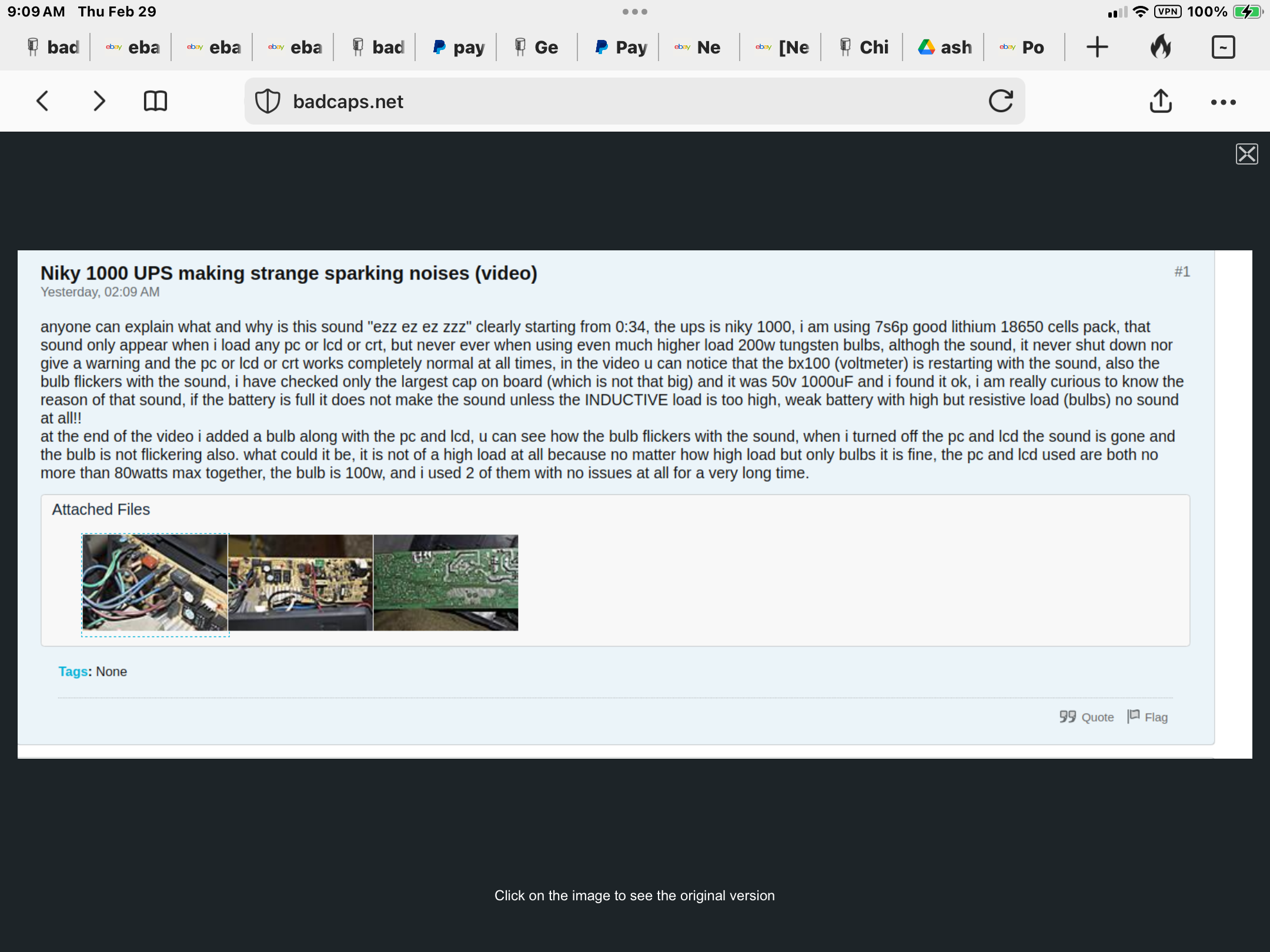 anyone can explain what and why is this sound "ezz ez ez zzz" clearly starting from 0:34, the ups is niky 1000, i am using 7s6p good lithium 18650 cells pack, that sound only appear when i load any pc or lcd or crt, but never ever when using even much higher load 200w tungsten bulbs, althogh the sound, it never shut down nor give a warning and the pc or lcd or crt works completely normal at all times, in the video u can notice that the bx100 (voltmeter) is restarting with the sound, also the bulb flickers with the sound, i have checked only the largest cap on board (which is not that big) and it was 50v 1000uF and i found it ok, i am really curious to know the reason of that sound, if the battery is full it does not make the sound unless the INDUCTIVE load is too high, weak battery with high but resistive load (bulbs) no sound at all!!