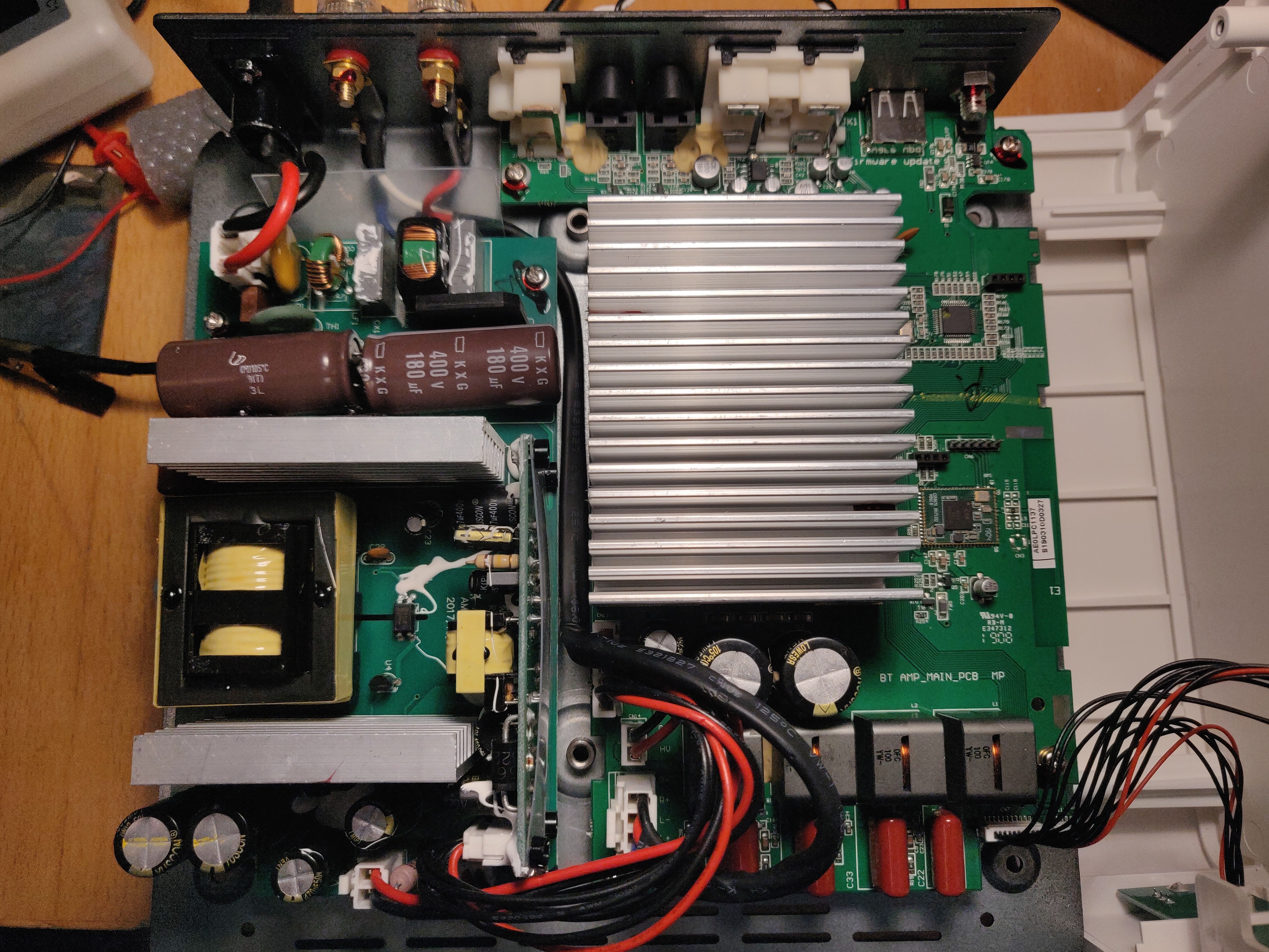 Parts arrived today, put in the new rectifier and power MOSFETs and nothing blew up, the lights come on and i can connect my phone via Bluetooth. So far, so great =). But... there is no sound. I've tried two different BT sources and connected via line-in. Also tried two different speakers. All seems to work without issue but without any sound coming to the speakers. Have no idea how to continue at the moment, any ideas welcome! Also, what do you think, should i focus my energy on the PSU or the motherboard at this time? From what i can tell using my IR camera there is nothing getting hot on the PSU meaning not much power is being drawn by anything. Attaching some pics of the whole setup assembled.