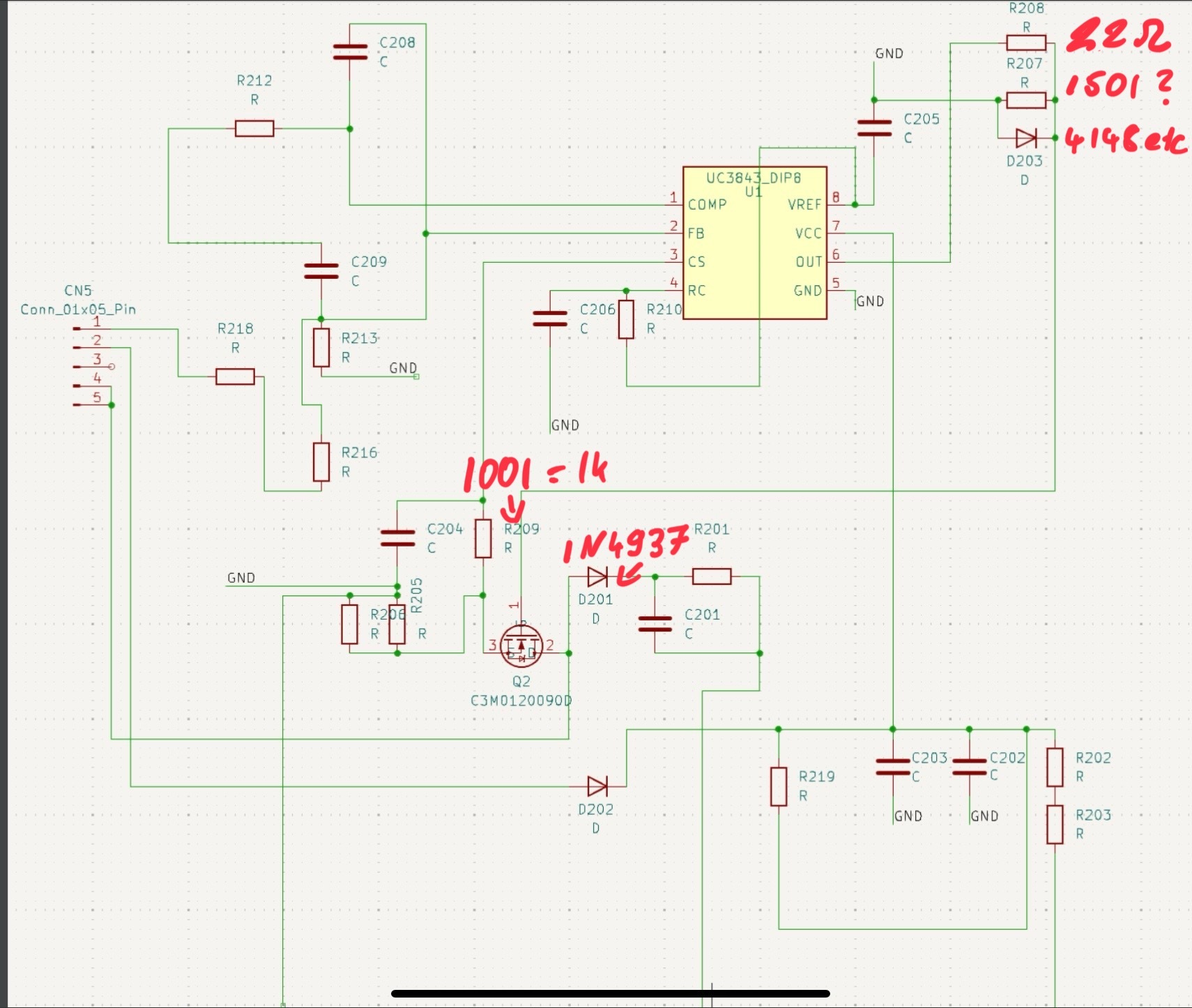 Pin 6 is VCC so that bigger resistor can’t be that high in value. Pin 7 is the destroyed gate drive with the smaller resistor and diode. The diode isn’t that critical but the gate drive resistor doesn’t have to be bang on, but should be as close as we can get it.