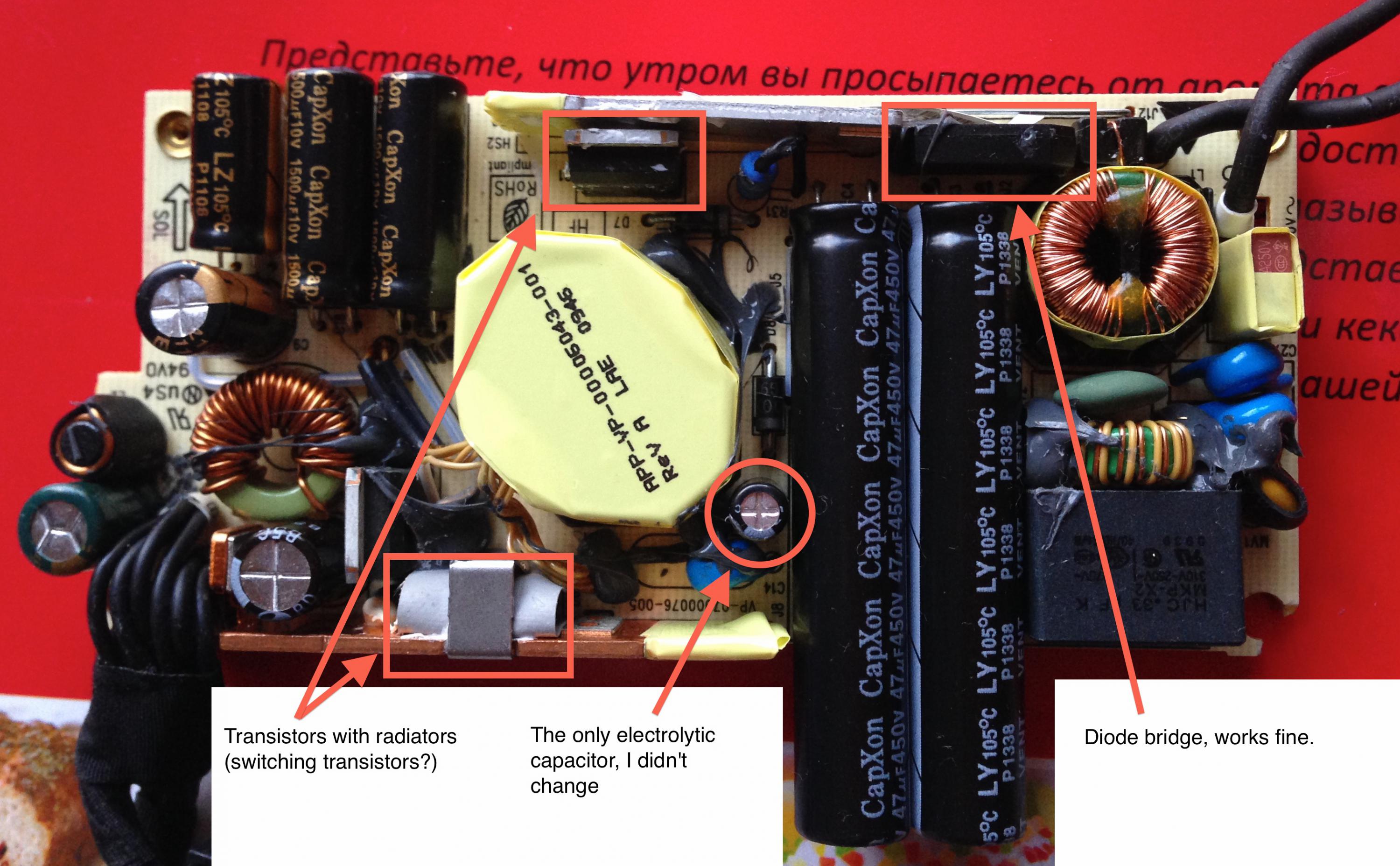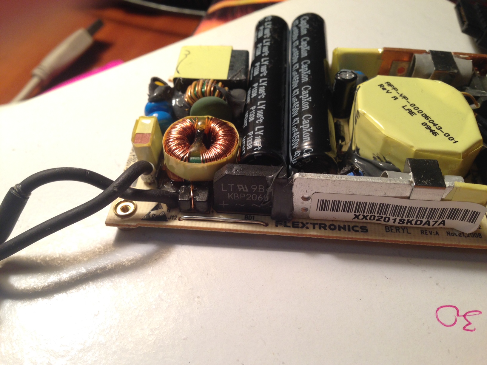 I don't have scheme so I don't know what to check next… So I'm ask maybe anybody know what the most possible can be broken (if no capacitors) in such power adapters. Manufacturer - Flextronics.