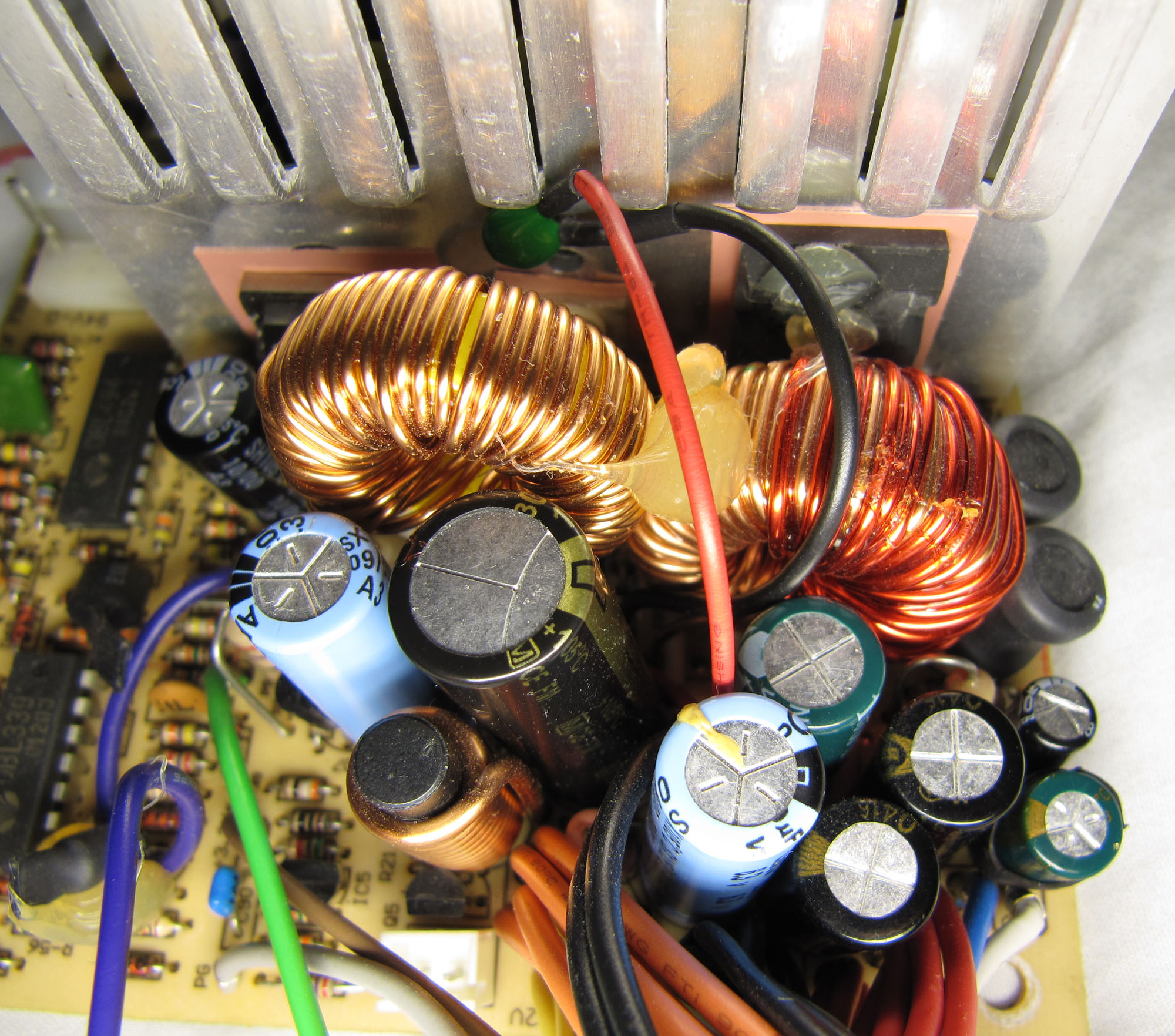The primary section includes a PBL405 bridge rectifier, 2x470uF 200V Capxon capacitors (their capacity is in specs) and 2x 2SC2625. All of them more than good for 250W continuous.