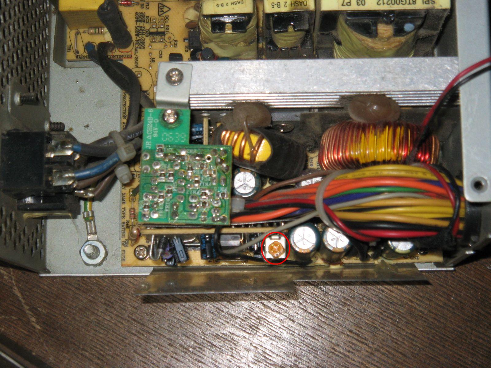 Then I spotted tiny potentiometer on one of PCBs and thought - what the heck, let's try to turn it and see what happens. That turned out to be voltage adjustment for 12V rail and probably other riles too. I adjusted 12V rail voltage with all components connected to about 11,75V and now this PC aparently works fine.