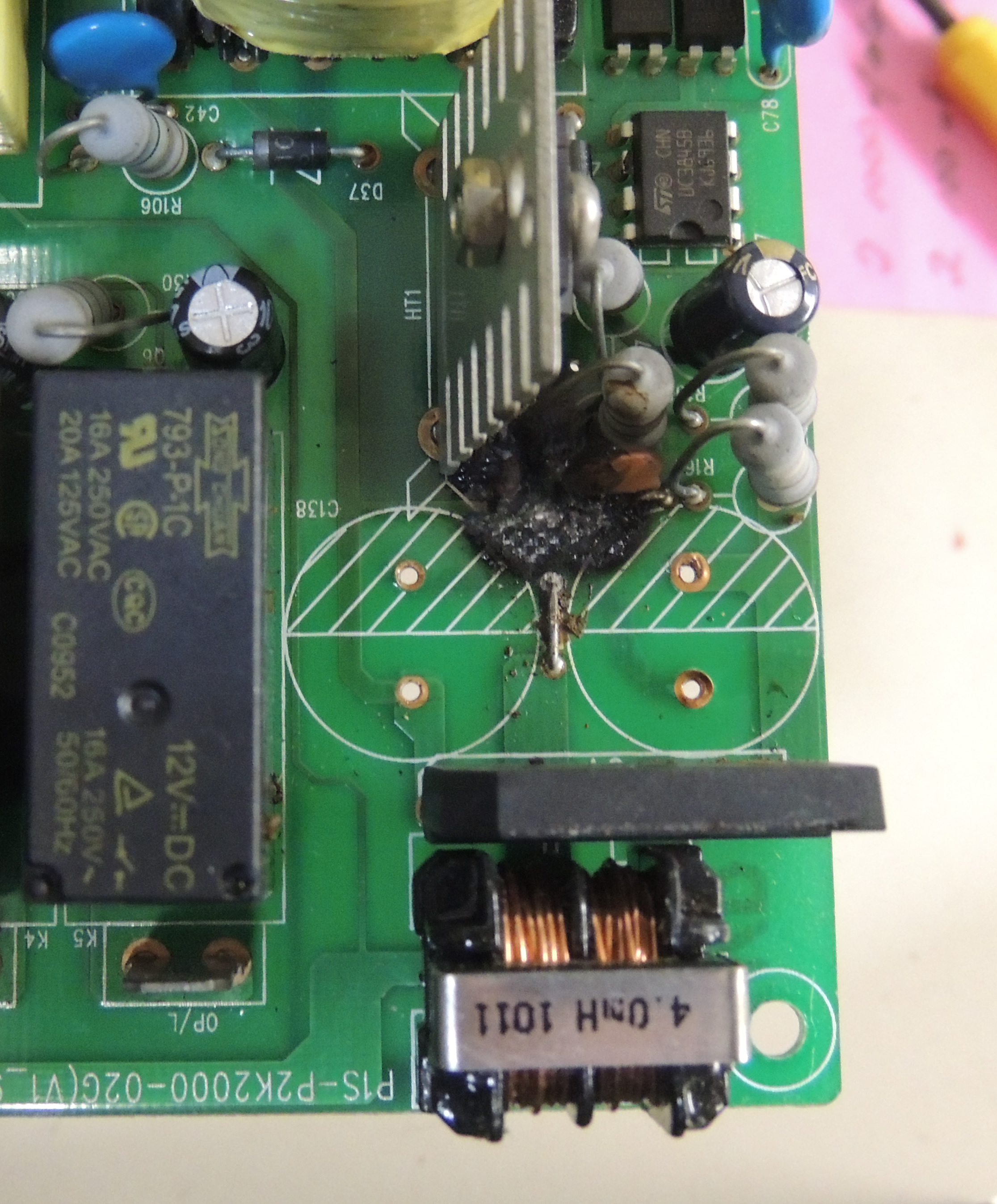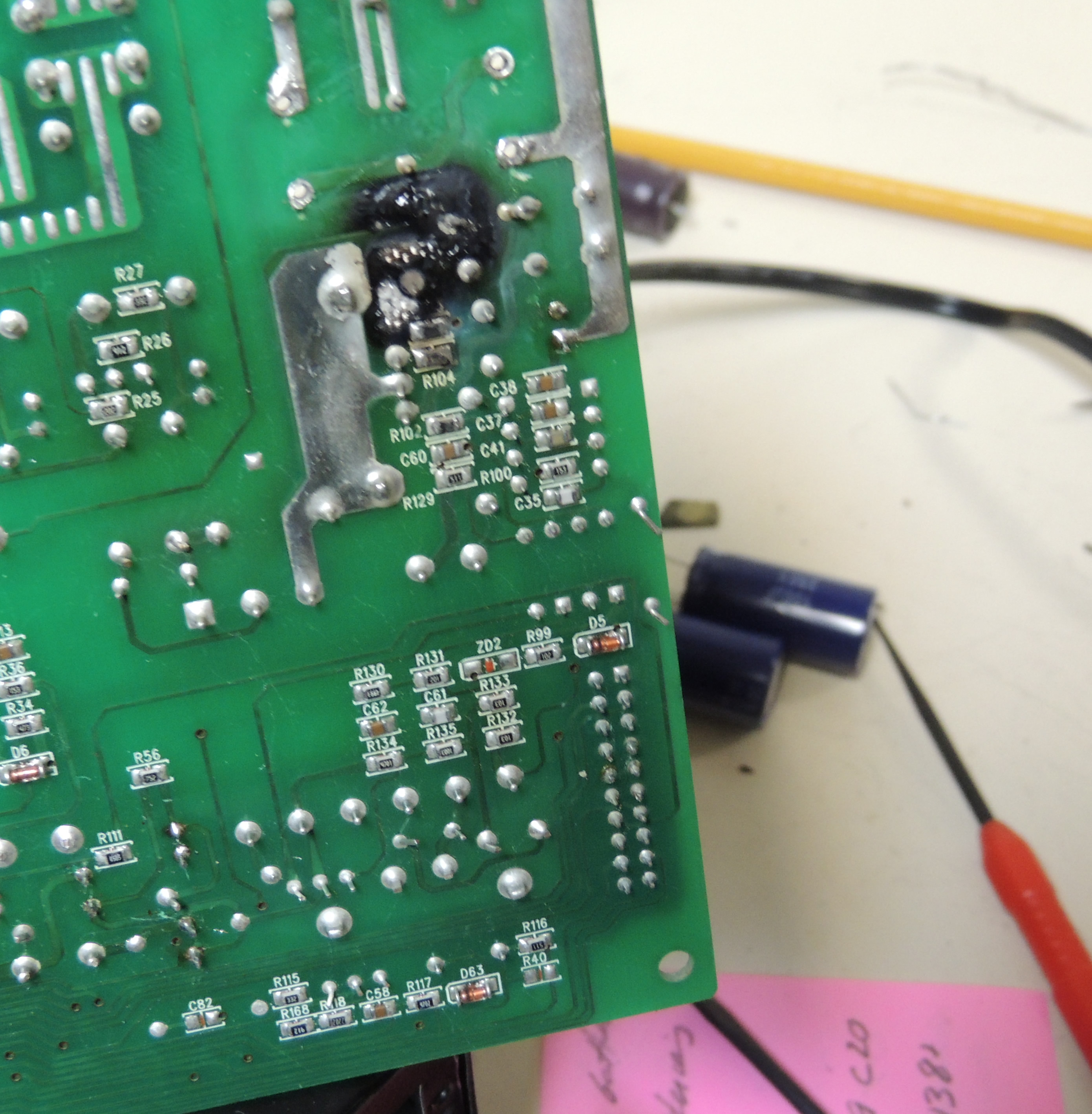 I found this post, and replaced capacitors 40, 44, 47 and 45. No joy. Here's where my situation is different. When I removed the board, I found scorching around twin capacitors C138 and the one next to it (scorching removed the number). Both are 100uF 250v. So I replaced them as well as 19 and 20 (1,000uf 63volts; no real reason other than that they were pretty big and since I was paying the minimum shipping from Mouser, why not?). Again, no joy.