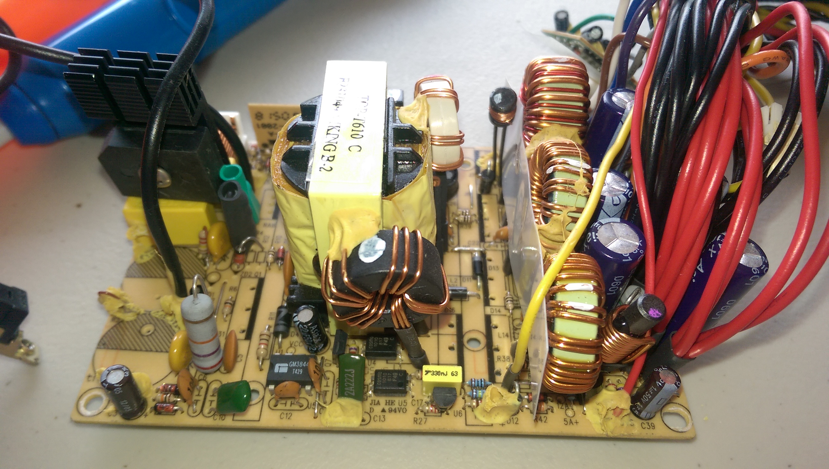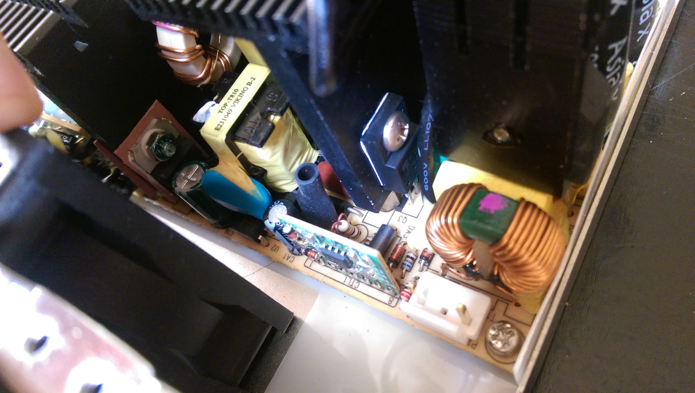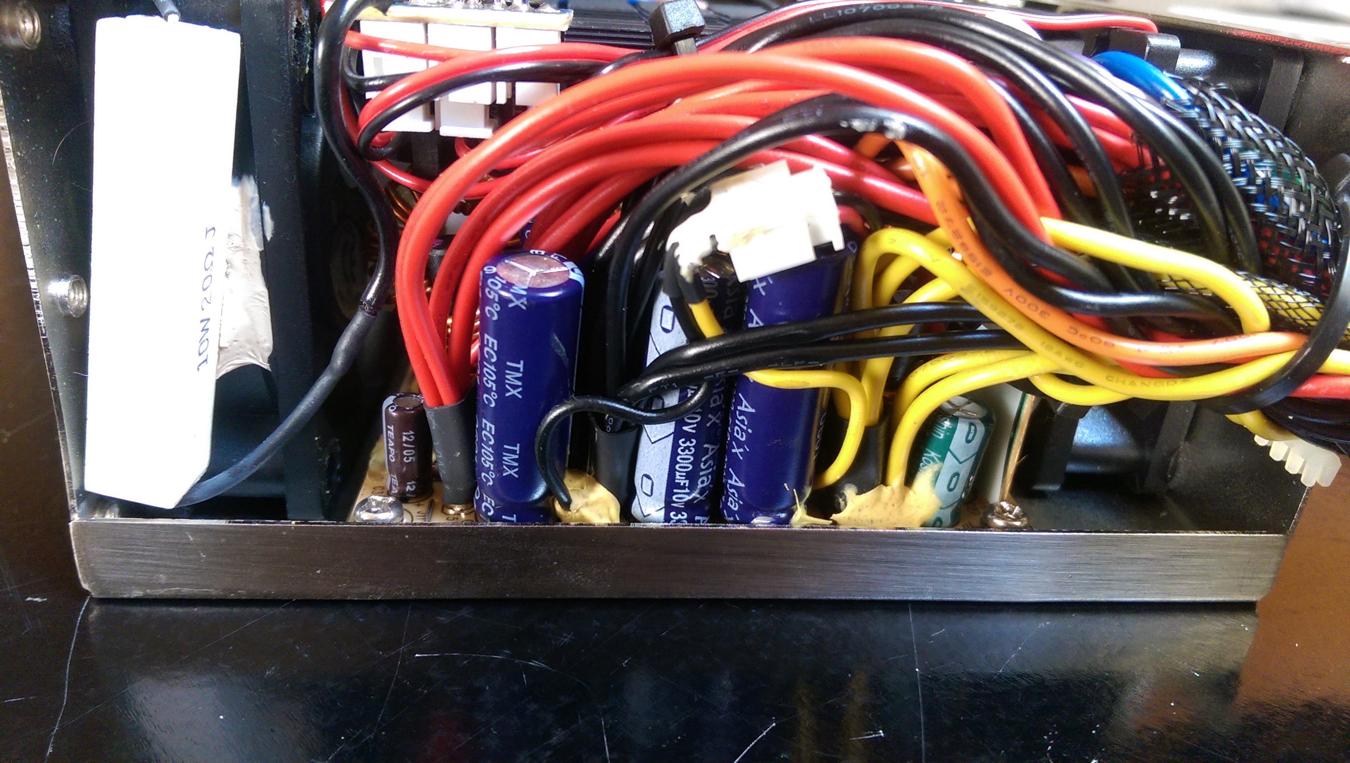 I know a lot is because of the 10W 20Ω resistor, but why is that thing connected to the fan controller anyways, to slow them down? You'd think the attached controller card would do that already. Besides that big resistor though, there must be some low values on the output rails. I'm not sure how none of the capacitors are bulging. Either this thing got almost no use, or some have failed without bulging. There's no way those decade old Asia'X, Koshin, Fuhjyyu TN, and Teapo SEK are all okay. This unit runs hot. It handled a 130W load no problem but it was kicking out quite a bit of heat. Not only will I have to replace all of the capacitors, but there's a fair amount of glue that needs to be removed. I'm guessing if the unit needs that 10W resistor, then at least swapping around the minimum load resistors will reduce some of the heat created.