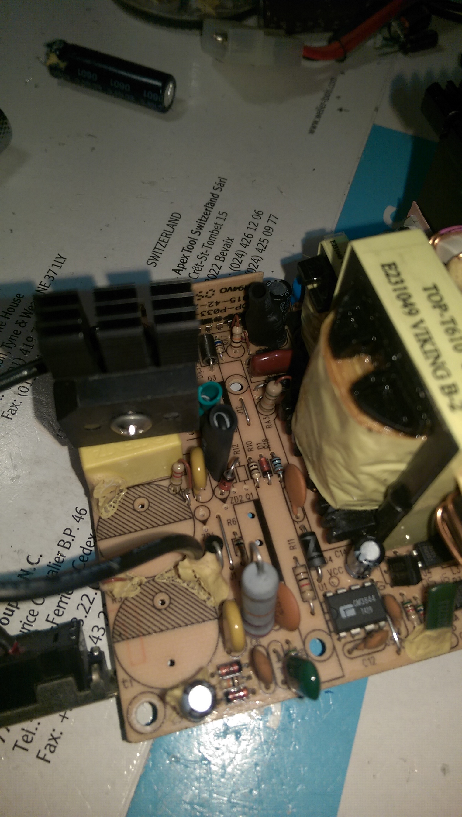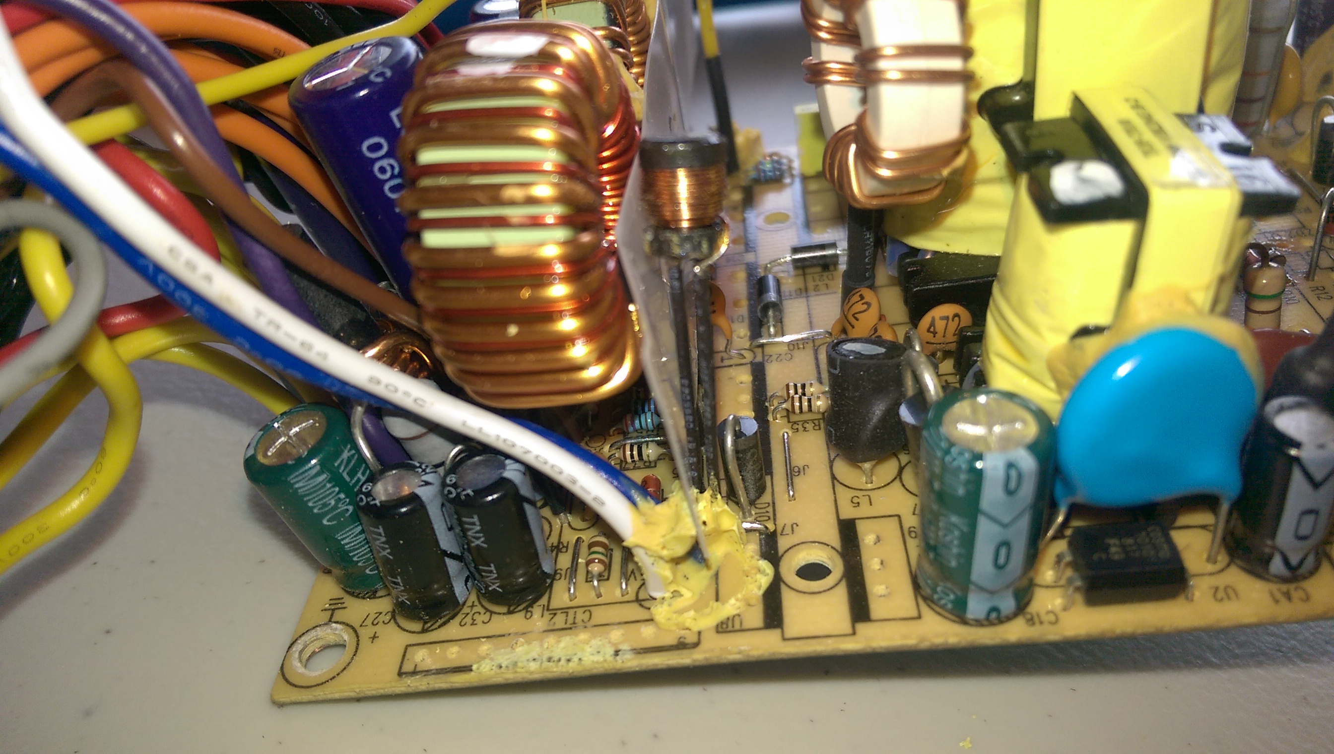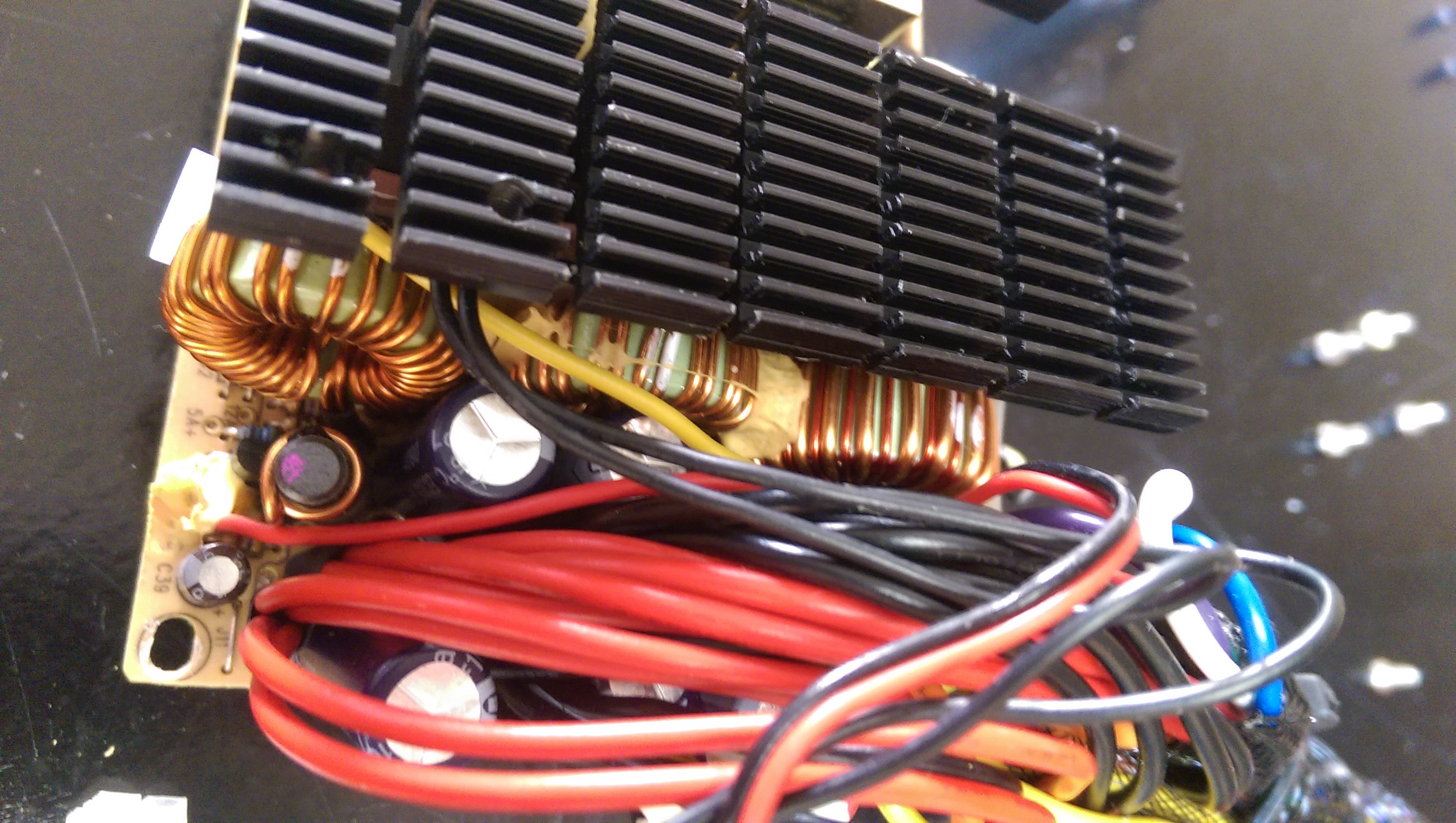 I know a lot is because of the 10W 20Ω resistor, but why is that thing connected to the fan controller anyways, to slow them down? You'd think the attached controller card would do that already. Besides that big resistor though, there must be some low values on the output rails. I'm not sure how none of the capacitors are bulging. Either this thing got almost no use, or some have failed without bulging. There's no way those decade old Asia'X, Koshin, Fuhjyyu TN, and Teapo SEK are all okay. This unit runs hot. It handled a 130W load no problem but it was kicking out quite a bit of heat. Not only will I have to replace all of the capacitors, but there's a fair amount of glue that needs to be removed. I'm guessing if the unit needs that 10W resistor, then at least swapping around the minimum load resistors will reduce some of the heat created.