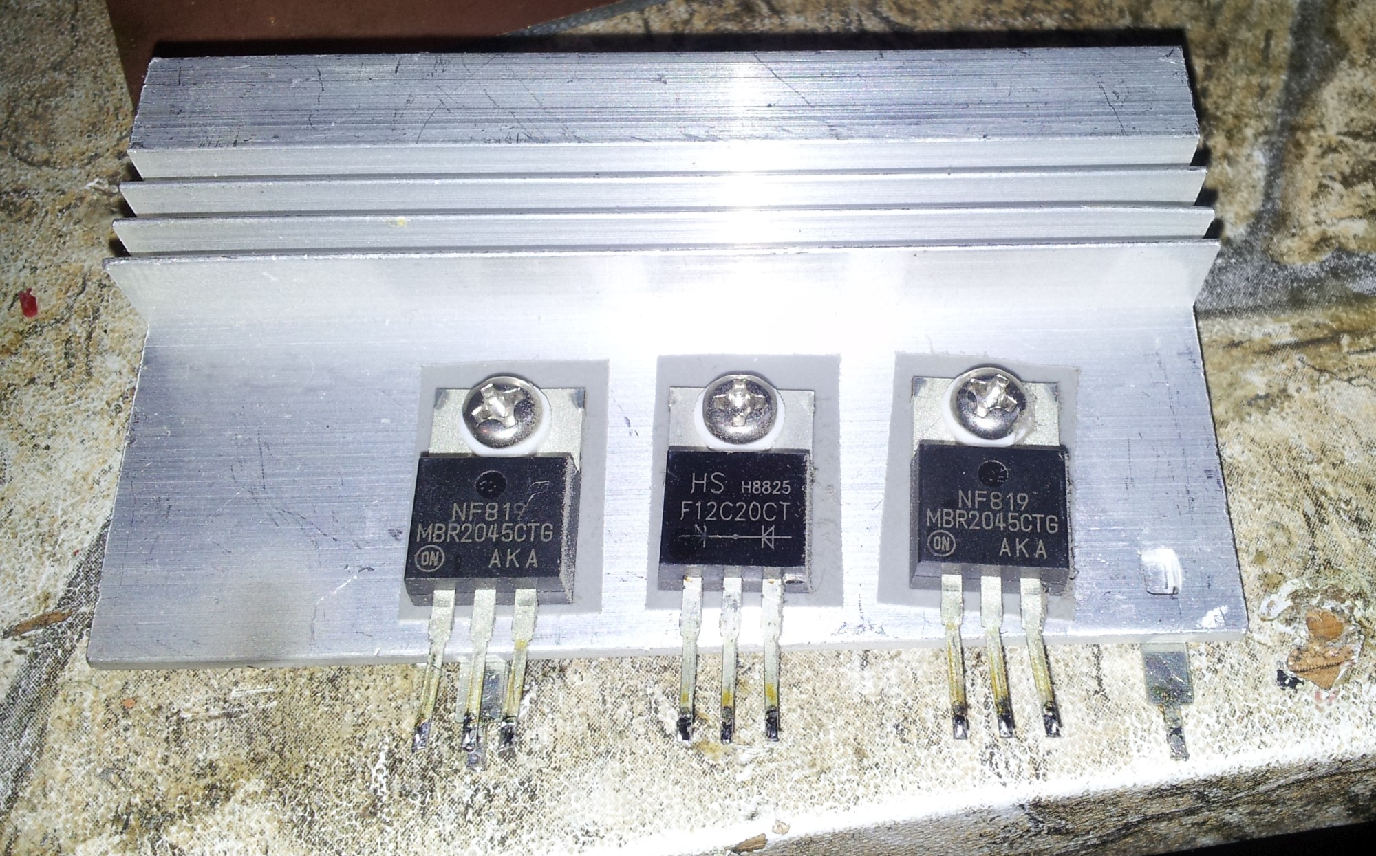 Exactly. I did actually test it like that and one of the MBR2045s failed short after a few hours. They were replaced with one 20100 and one 3060 in parallel. With 50A worth of diodes, this isn't gonna have 12v capacity problems, ever.
