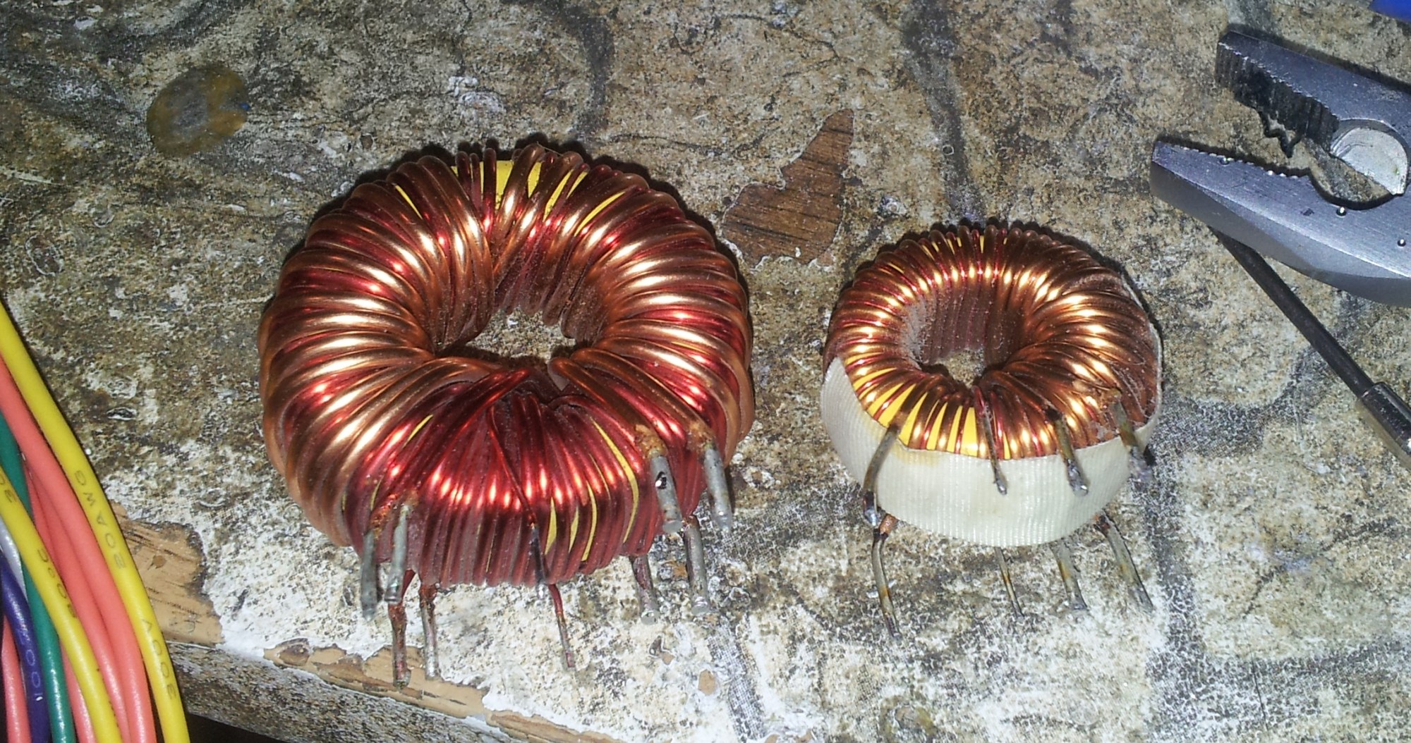 All pi coils were installed and the output filter toroid for 5v and 12v was replaced with something more appropriate. Interesting to note is that i checked the two toroids with my LC meter and they registered the same values. Of course, the larger one will have more current carrying capacity before it saturates. The coil i installed used to have a -5v winding as well - i have unwound that before installing it.